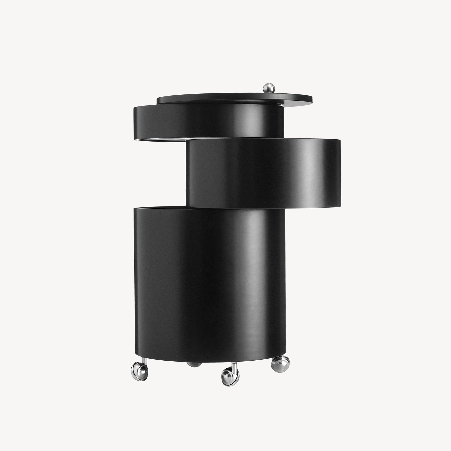 Adaptable side table and mobile storage unit in one. Barboy consists of three oval-shaped drawers, which can be pulled out fully so the whole surface can be used. Barboy is a typical example of Panton’s furniture, in which he combines a matt surface with a shiny chrome handle and wheels, investing the piece with an elegant contrast.