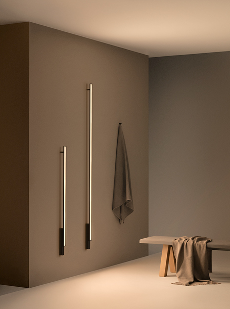 Minimalist and refined in form, the Spa wall lamp is an adaptable system of linear LEDs that allows for limitless compositional freedom to create a broad range of atmospheres, from intimate corners for personal wellbeing to functional spaces designed for general wellness. Particularly apt as a vanity light, the Spa wall lamp is positioned at an angle to send diffuse, ambiance light in the desired direction.