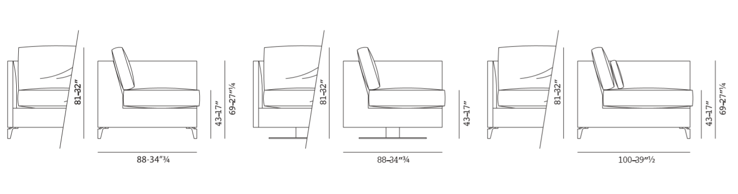 The 960 Zone armchair is available in 4 different sizes and with backrest cushions of different heights. The most interesting features of 960 Zone are its high and slim arms, the numerous seat sizes available, the possibility to have a cover with valance, the different types of feet and a variant with a swivel base.