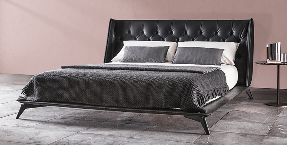 Vibieffe 5700 Opera is a double bed with a button-tufted headrest, available in different sizes and with leather covers. The bed base can be lifted to access the storage space underneath.