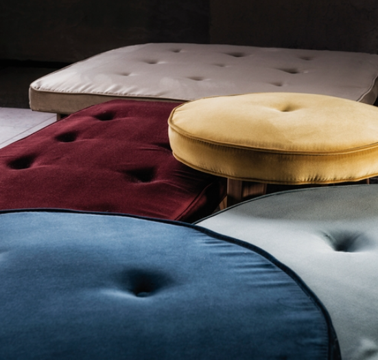 The 9300 Pancake ottomans are characterized by a design inspired by the combination between classical and contemporary elegance and by modular elements that can be freely combined. Designed in different shapes, they can be covered with a soft fabric or leather seat to become informal and comfortable ottomans, linear, colourful, portable and functional.