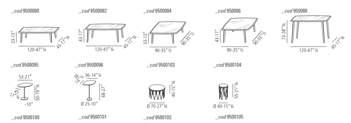 The 9500 080, 082, 084, 086, 088 coffee tables' design emphasizes their light and functional lines as well as the elegant look of their marble or mirror tops. These coffee tables are the perfect match with every Vibieffe sofa and armchair.