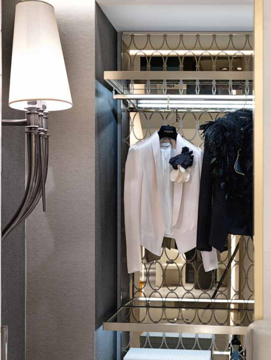 Modular wall system, made of modules by 90 and 110 cm h. 260 cm. Wall carrier panel in MDF covered in bronze mirror glass, decorated with metallized gold lacquer “ovals” graphic. Accessories available: - shelf (90/110 x 52 cm) in smoked glass with profile in satinized stainless steel and internal LED lighting; - shelf (90/110 x 52 cm) in smoked glass with profile in satinized stainless steel with clothing bar and internal LED lighting; - 2-drawer unit (90/110 x 52 h. 45) covered in leather or fabric with handles in satinized stainless steel, including 1 internal drawer; - 1-drawer unit (90/110 x 52 h. 22 cm) covered in leather or fabric with handle in satinized stainless steel; - trouser rails (90/110 x 52 h. 22 cm) covered in leather or fabric with 1 drawer and handle in satinized stainless steel; - base shelf (predisposed for ground laying) in MDF covered in leather or fabric with border in satinized stainless steel. Metal parts available in the metal finishing selection.