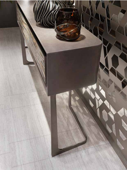 Console with 2 drawers, structure in plywood covered in leather or in lacquered wood, grooves and frames in satinized stainless steel, front decorative panels in marble or in natural cleft stone with inserts in shiny stainless steel. Legs in satinized stainless steel. Metal parts available in the satinized metal fifinishing selection.