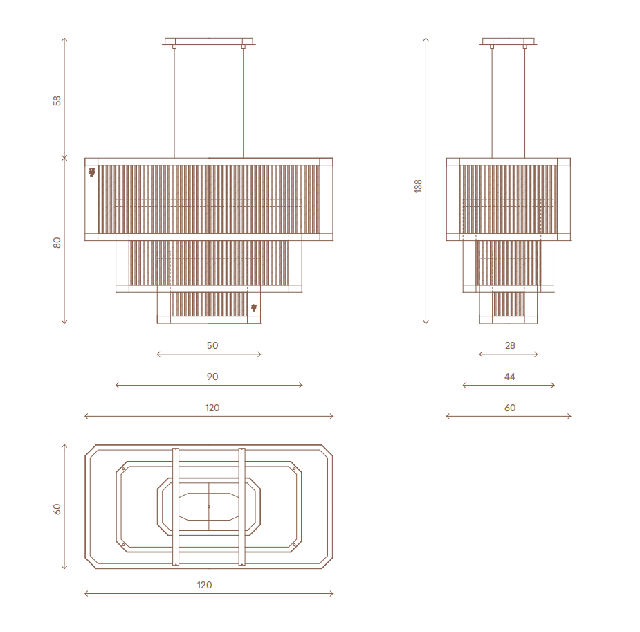 Chandelier in glass disposed on 3 levels. Main structure in steel and satinized brass, chrome or gold fifinishing, with faceted edges and sides in grooved glass. Warmlight LED bars integrated in the structure. Ceiling cup in satinized steel with adjustable suspension in steel wire cable, max 220W in total, weight 90 kg.
