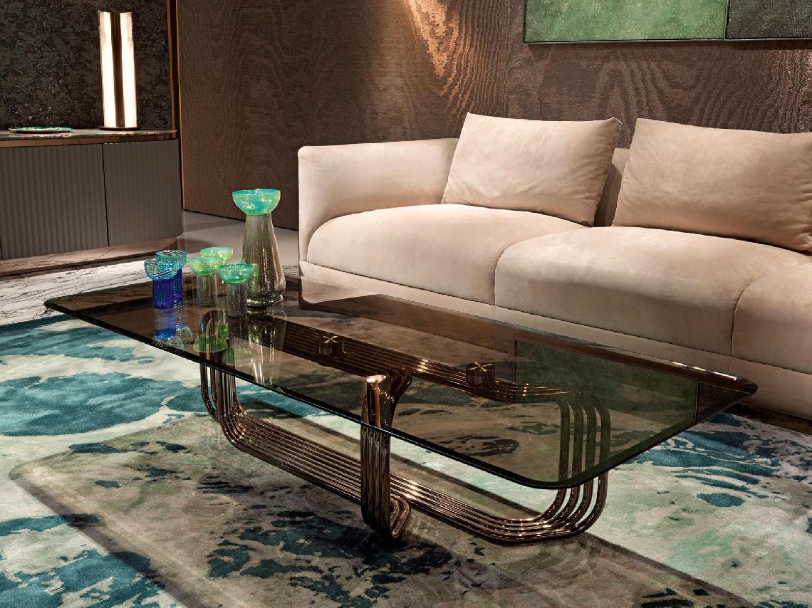 Console with metal tubular structure in chrome finish, suspended top in glass or marble.