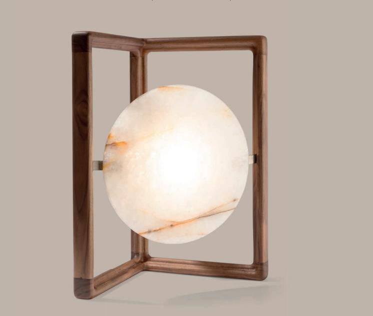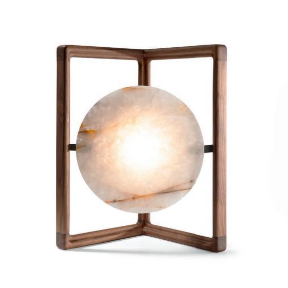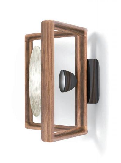 Wall lamp in Canaletto walnut solid wood with light diffuser in quartzite or onyx. Metal spotlight with LED bulb.