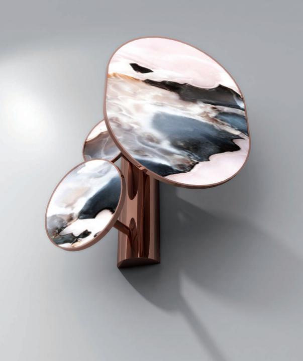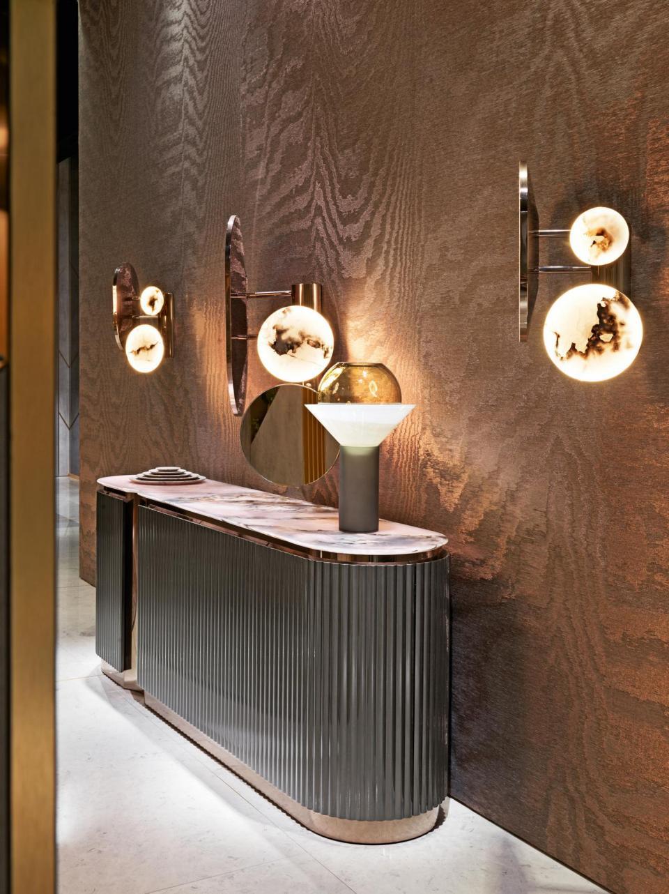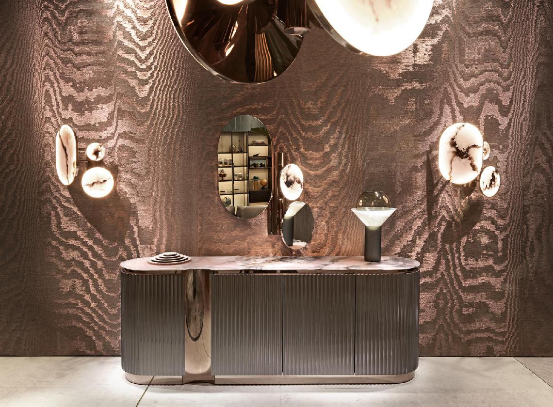 Chandelier and applique in chromed metal with light diffusers in Onyx and steel.