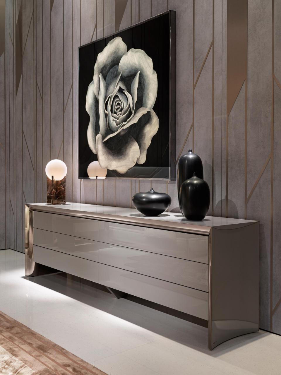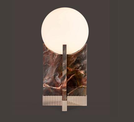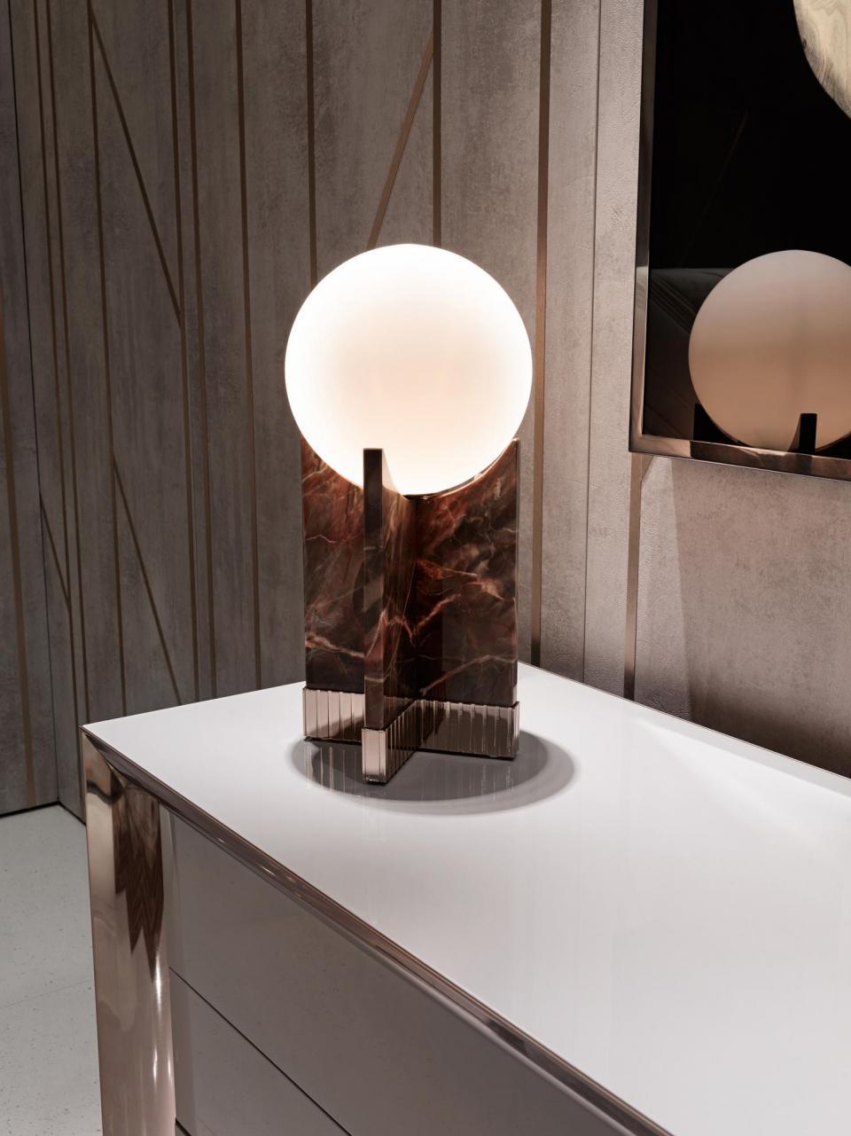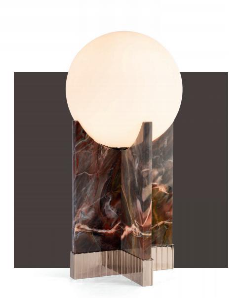 Table lamp in marble and steel. Structure in metal with lowrelief stripes decoration and central part coated in marble. Round light diffuser in blown glass with satin opaline finish.