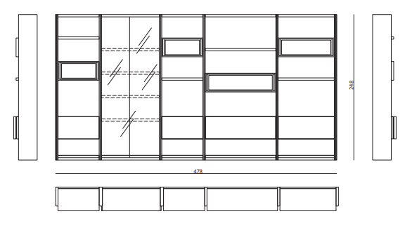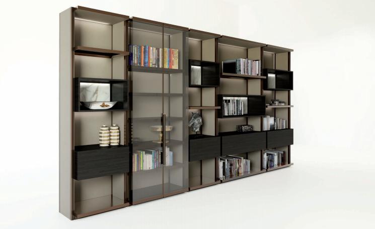 Modular library composition in aluminium and glass. Supporting lateral sides consisting of a double pillar made in powder-coated aluminium with a shiny decorative profile, and lateral panels upholstered in leather or fabric, or coated in veneered wood, marble or decorative laminate. Pillars supplied with electrified track for LED light and hidden predrilled holes to adjust the height of the shelves. Shelves in aluminium with crystal glass surface and profile with LED light, and equipped with plug & play technology to move shelves without using tools. Open shelves in wood (lacquered or veneered) with back in marble and perimetral light. Chests of drawers (lacquered or veneered) can be customised internally, adding a cutlery or bottle drawer. The composition consists of open units with or without back (available either upholstered in leather or fabric, or coated with decorative laminate). Modular units can be configured with doors in boxed tempered crystal glass (width 8 mm) with handles in aluminium with polished finish or leather upholstery