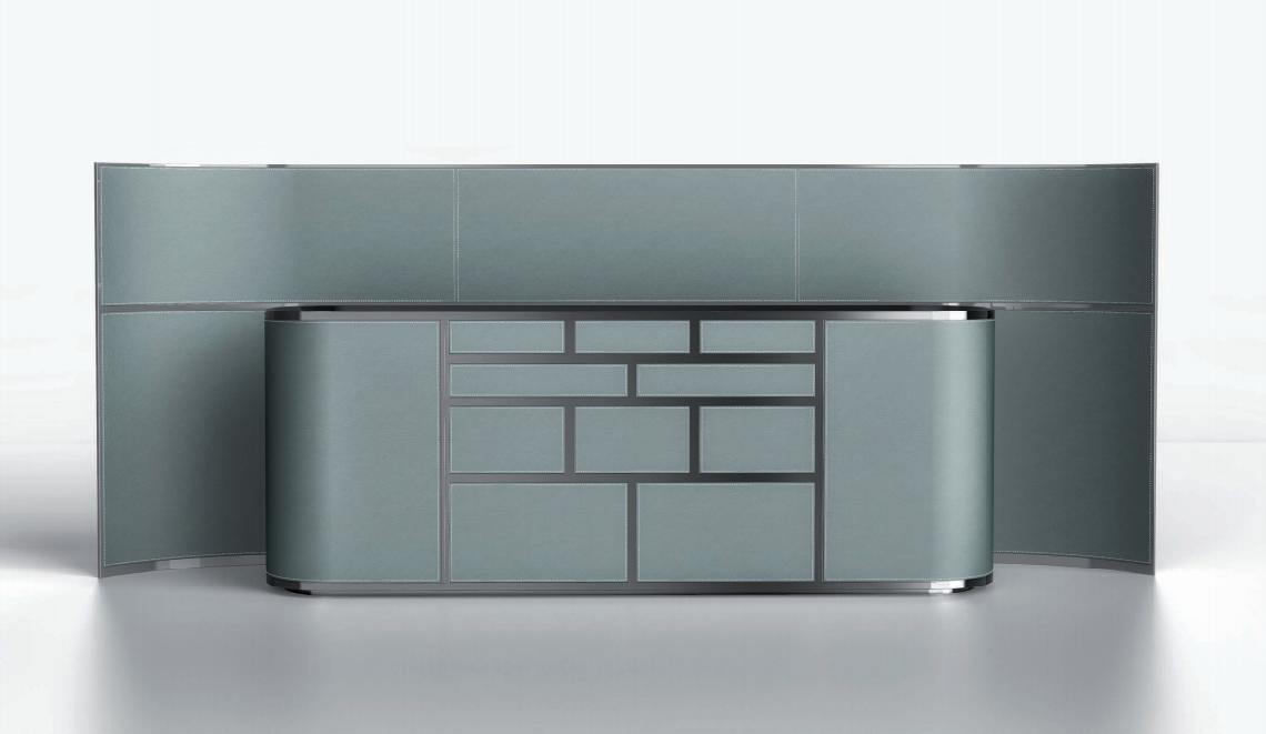 Storage cabinet in curved wood with lacquered edges decorated with hand-made 100 gloss finish. Internally upholstered in microfiber, external surfaces and front panels of drawers upholstered in leather with visible stitches. Equipped with internal LED lighting system.