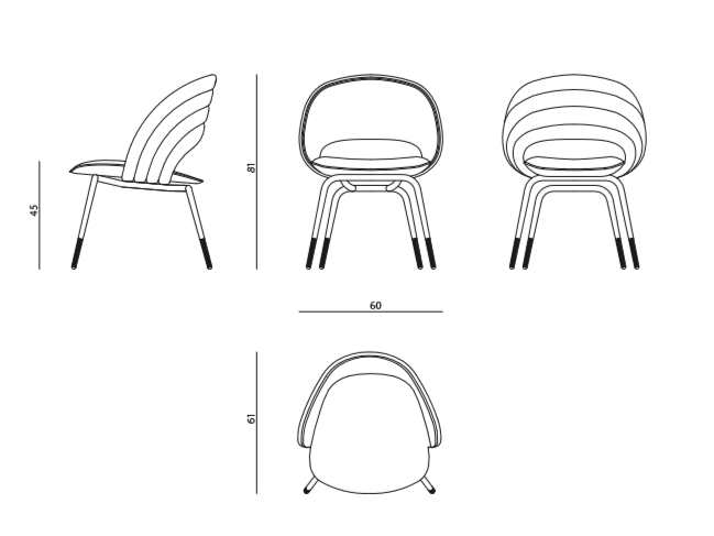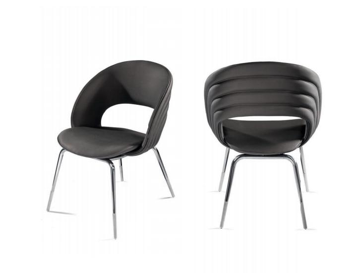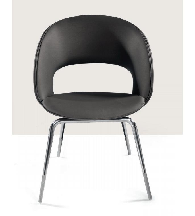 Chair in curved wood with tubular conic legs and turned feet. Quilted upholstery in leather or fabric.