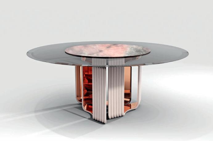 Round glass dining table with Lazy Susan in marble. Metal legs with quilted upholstery in leather or fabric, internally coated in stainless steel.