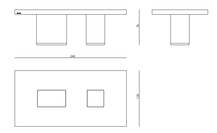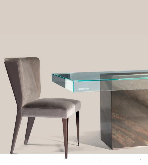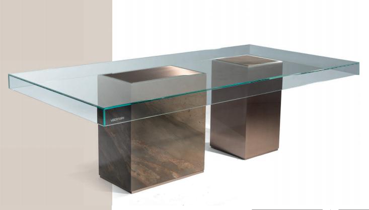 Dining table. Top in boxed extra-clear glass (width 12 mm) with UV-welded vertical ribs. Bases in wood coated with marble and satinized stainless steel, tops of the bases are flush to the glass.