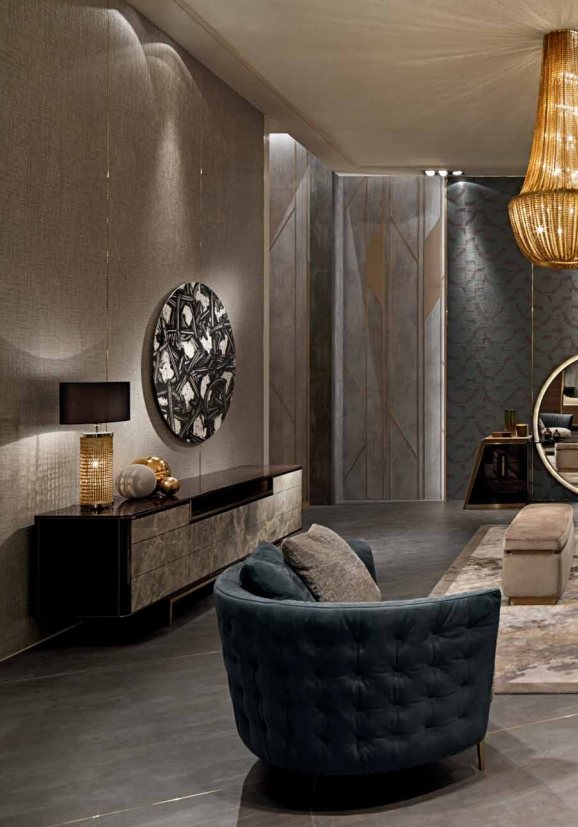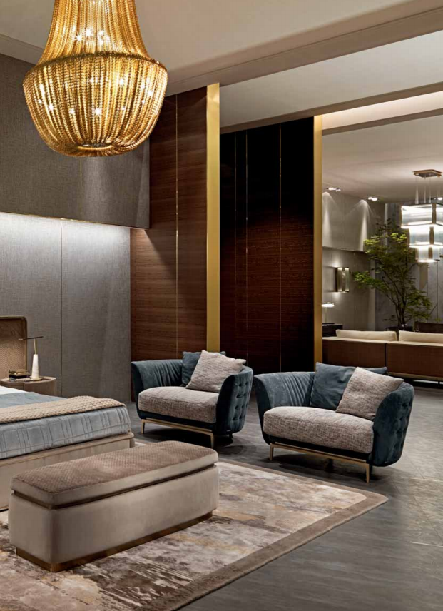 Structure in solid wood and plywood with elastic straps, padding in polyurethane with different densities. Upholstered in leather or fabric. Quilted backrest. Rear feet upholstered in leather or fabric. Base and front feet in satinized stainless steel available in the metal fifinishing selection.
