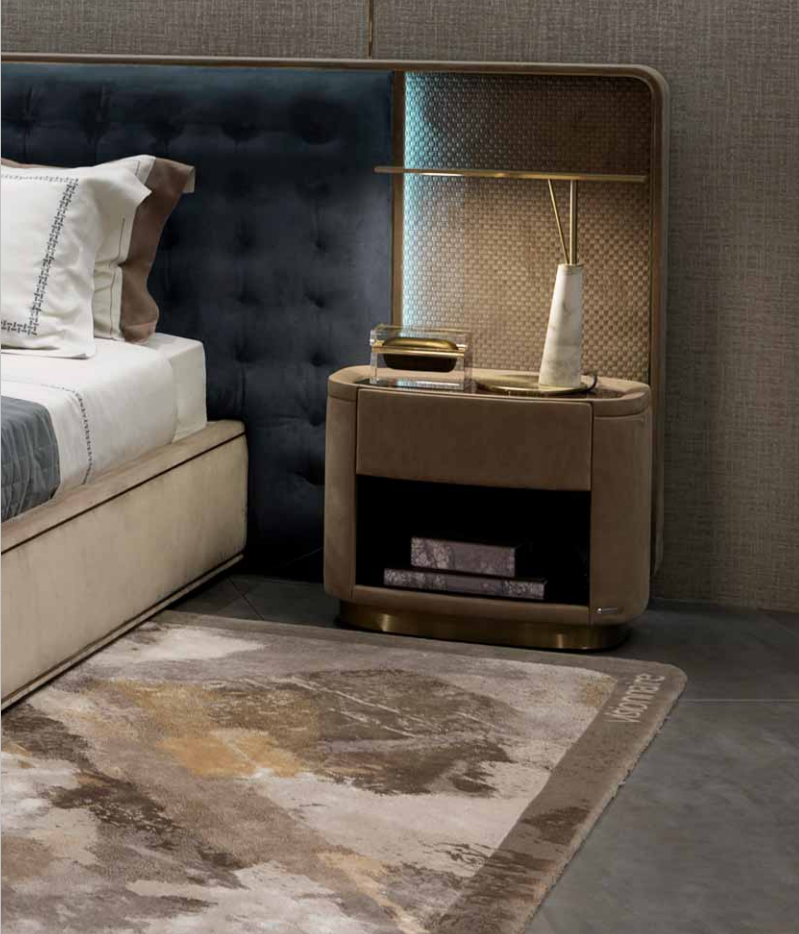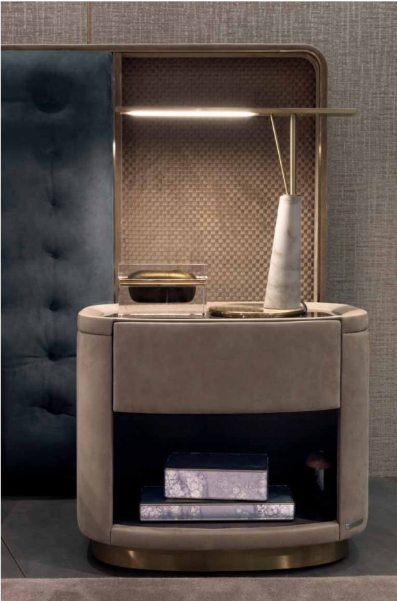 Bedside table upholstered in leather or fabric with drawer and open lower shelf, slightly padded curved structure in plywood, drawer with damped runners, internal part matt lacquered and upholstered front part. Top and lower shelf in bronze or smoke mirror. Curved base in MDF, coated in satinized stainless steel. Metal parts available lacquered in gold, champagne, bronze, Siena, black nickel and gunmetal fifinishing.