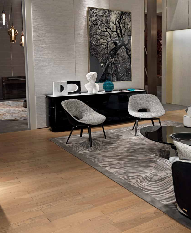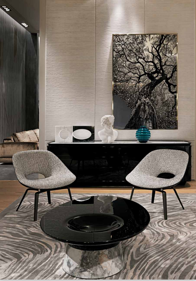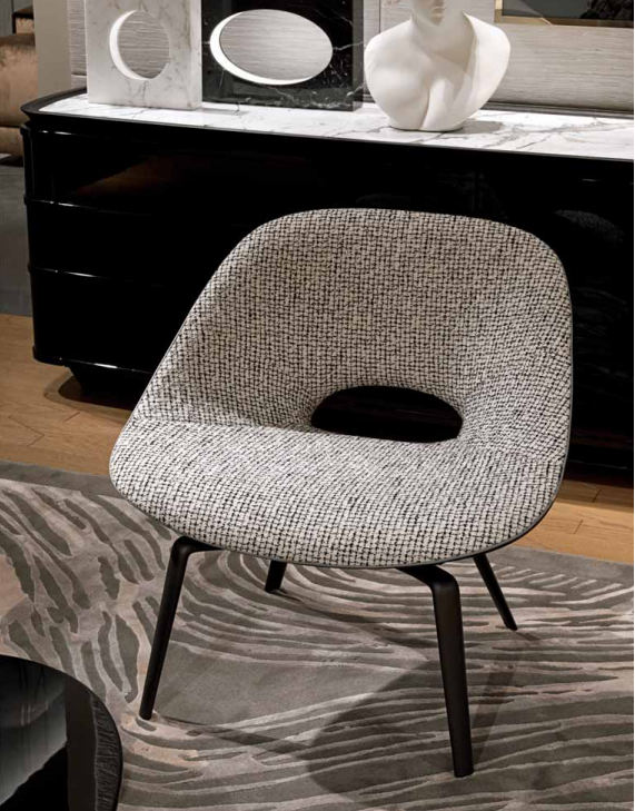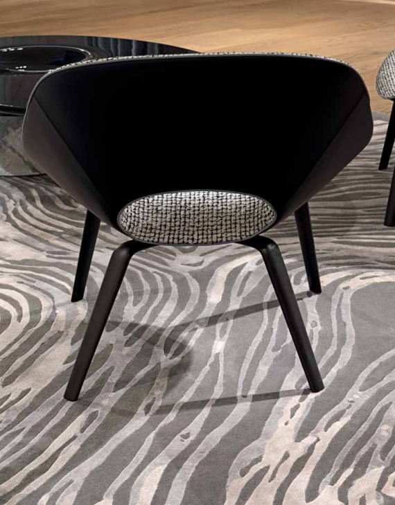 Armchair in cold-cured PU Foam molding with internal metal shell. Upholstery in leather or fabric; the external part can be covered in contrast with the internal part, divided by a leather thread, upholstery fifinished on the back with manual stitching. Legs in aluminium cast, with pearl anthracite matt fifinish and stainless steel feet, available in the metal fifinishing selection.