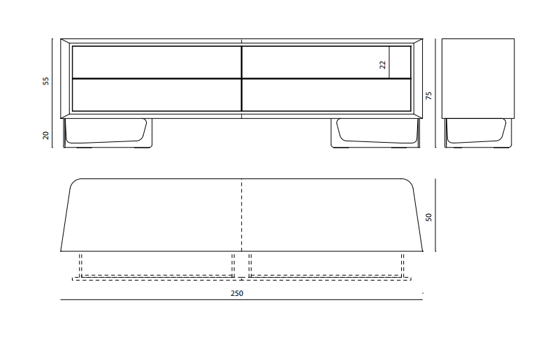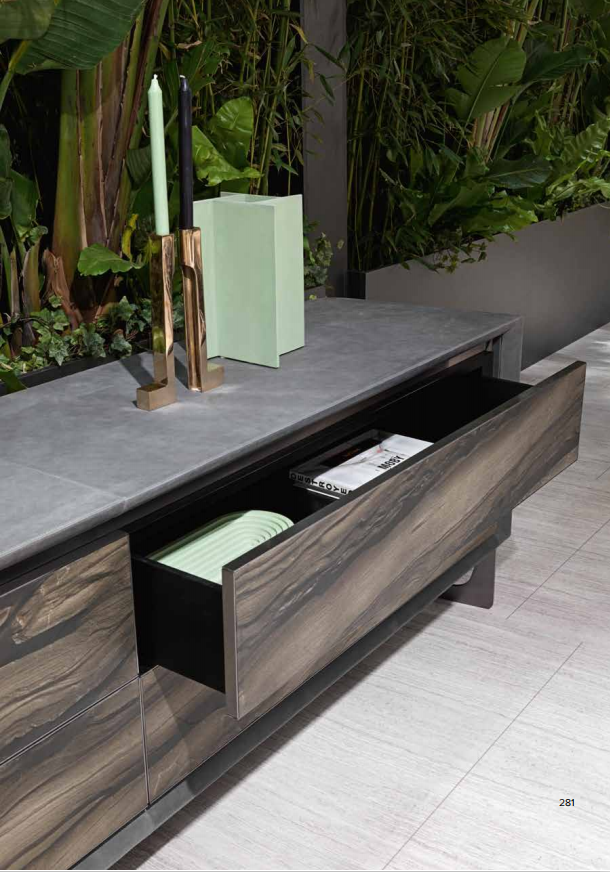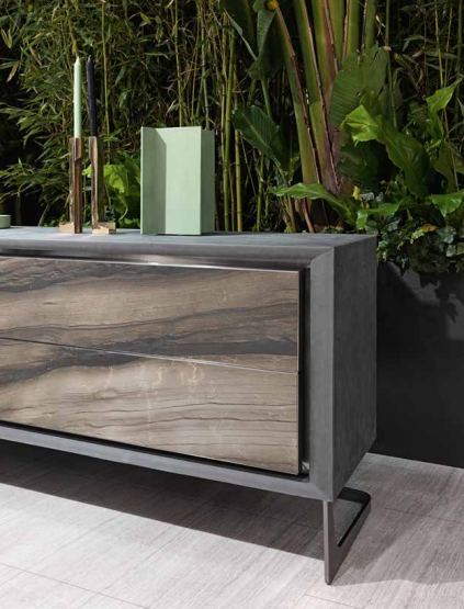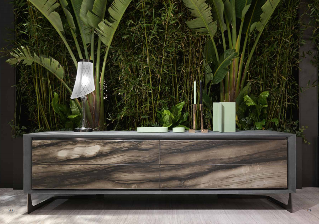 Structure in plywood with 4 drawers, covered in leather or in lacquered wood, doors grooves and frames in satinized stainless steel, front decorative panels in marble or in natural cleft stone with inserts in shiny stainless steel. Front panels also available in “metal craquelè” finishing in bronze, manganese, gold or lead. Legs in satinized stainless steel. Legs in satinized stainless steel. Metal parts available in the satinized metal finishing selection.
