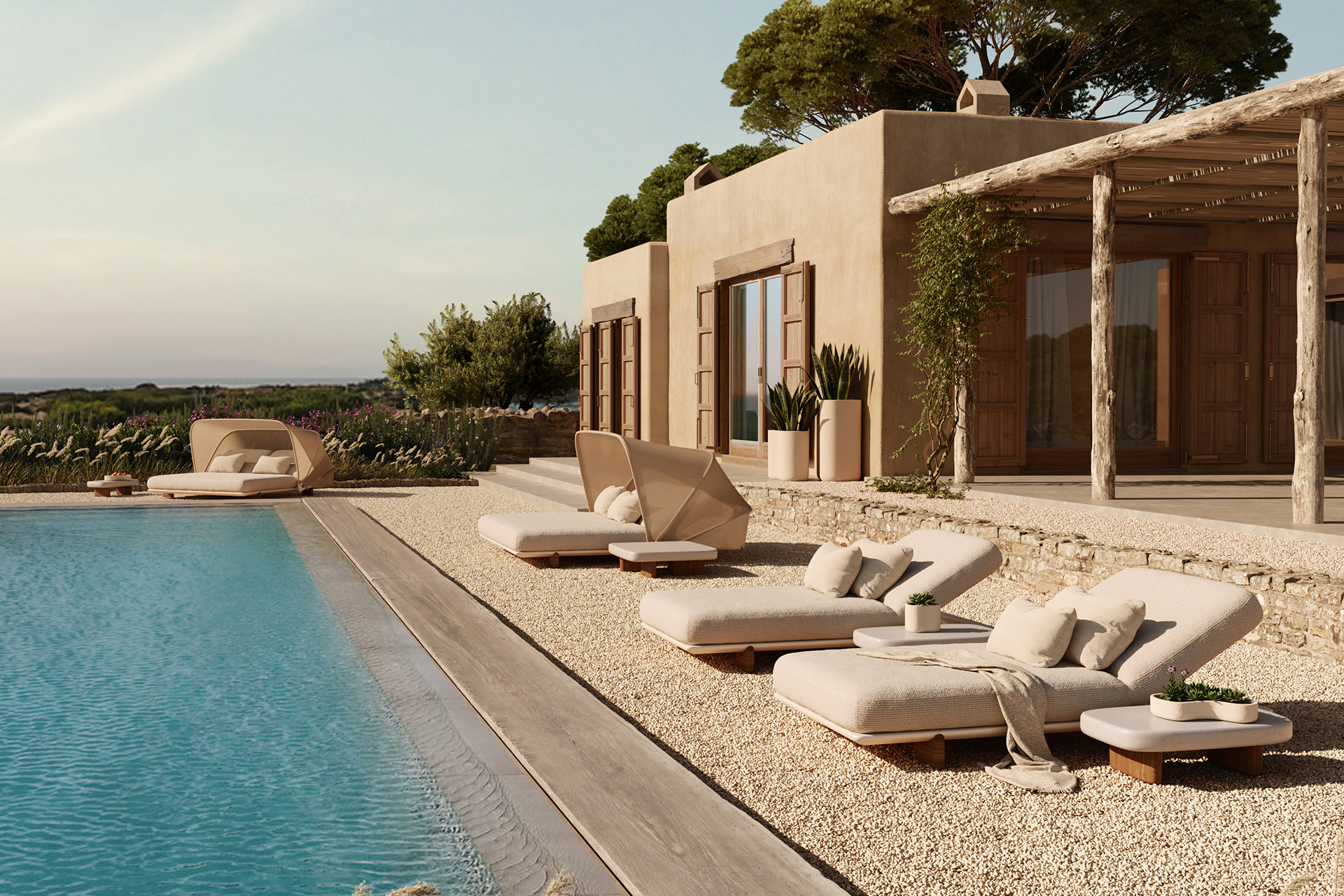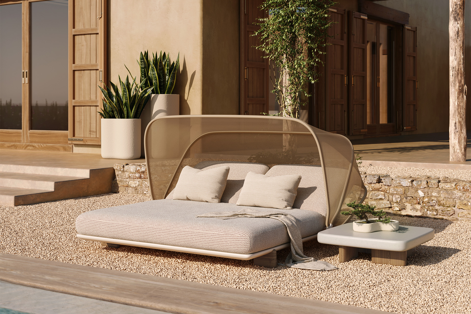 The Milos collection daybed combines functionality and beauty in perfect harmony. Precision crafted, it features a lacquered aluminium frame that ensures exceptional resistance to outdoor conditions, while its elegant iroko wood legs add a touch of warmth and sophistication, providing stability and a connection to nature.