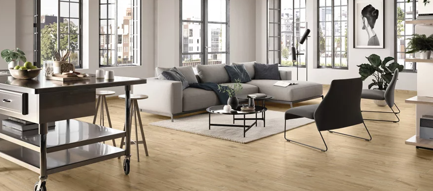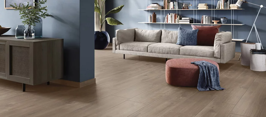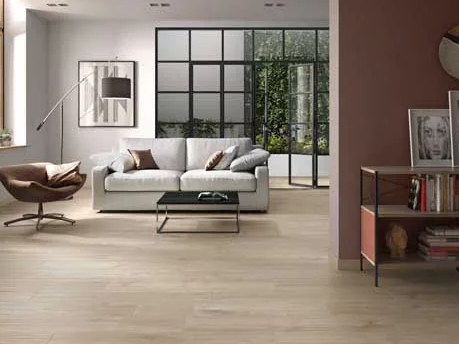 The OAK PARK design features a calm wood look inspired by fine-grained oak. The calm, natural quality of the floor tiles in unglazed vilbostone porcelain stoneware is subtly underscored by a gentle relief. There is a choice of six wood colours featuring gentle shading without any sudden changes of colour – from light cream-white shades through bold browns to expressive dark colours.