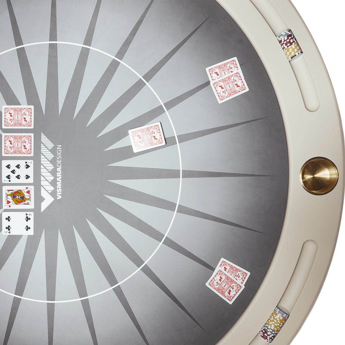 Elegance, strong personality, authenticity are the main features which are contained in this round poker table design for 6 players. The lacquered glossy pearl grey ring base is in wood and gold stainless steel profiles, the Soft touch pearl grey table edges are equipped with chips racks and cup holders. The playing surface is slightly padded, covered by customizable cloth.