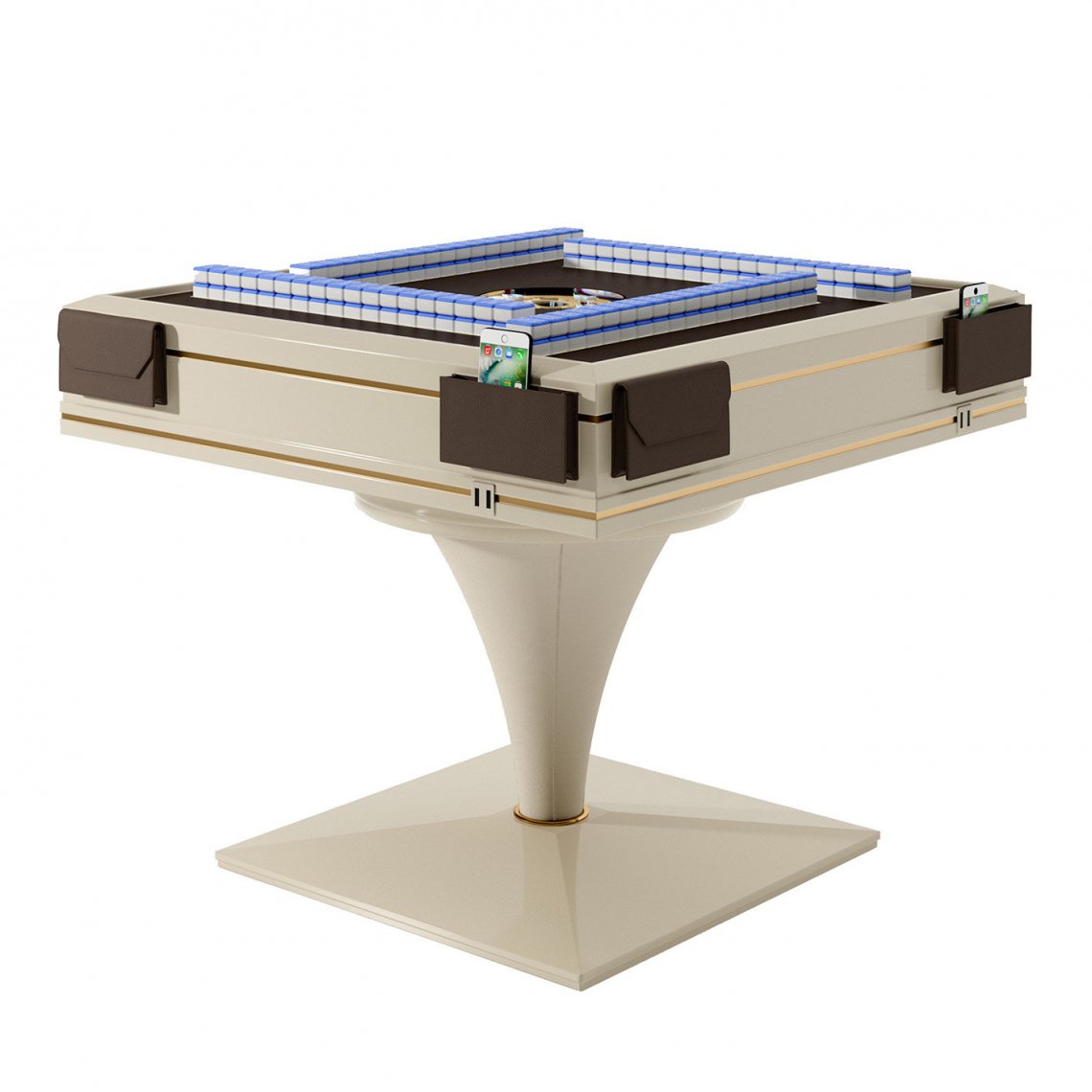 A sophisticated object of design, this Mahjong table is a tribute to the ancient tile-based, strategy game originating in China. Completed with two sets of playing tiles, it features a refined structure fashioned of lacquered MDF and adorned with gold-plated steel details. The playing surface is upholstered with leather, and is equipped with a hidden mechanism that automatically sorts and pulls out Mahjong tiles. Each player station features a double USB ports and removable storage pockets also upholstered with leather.