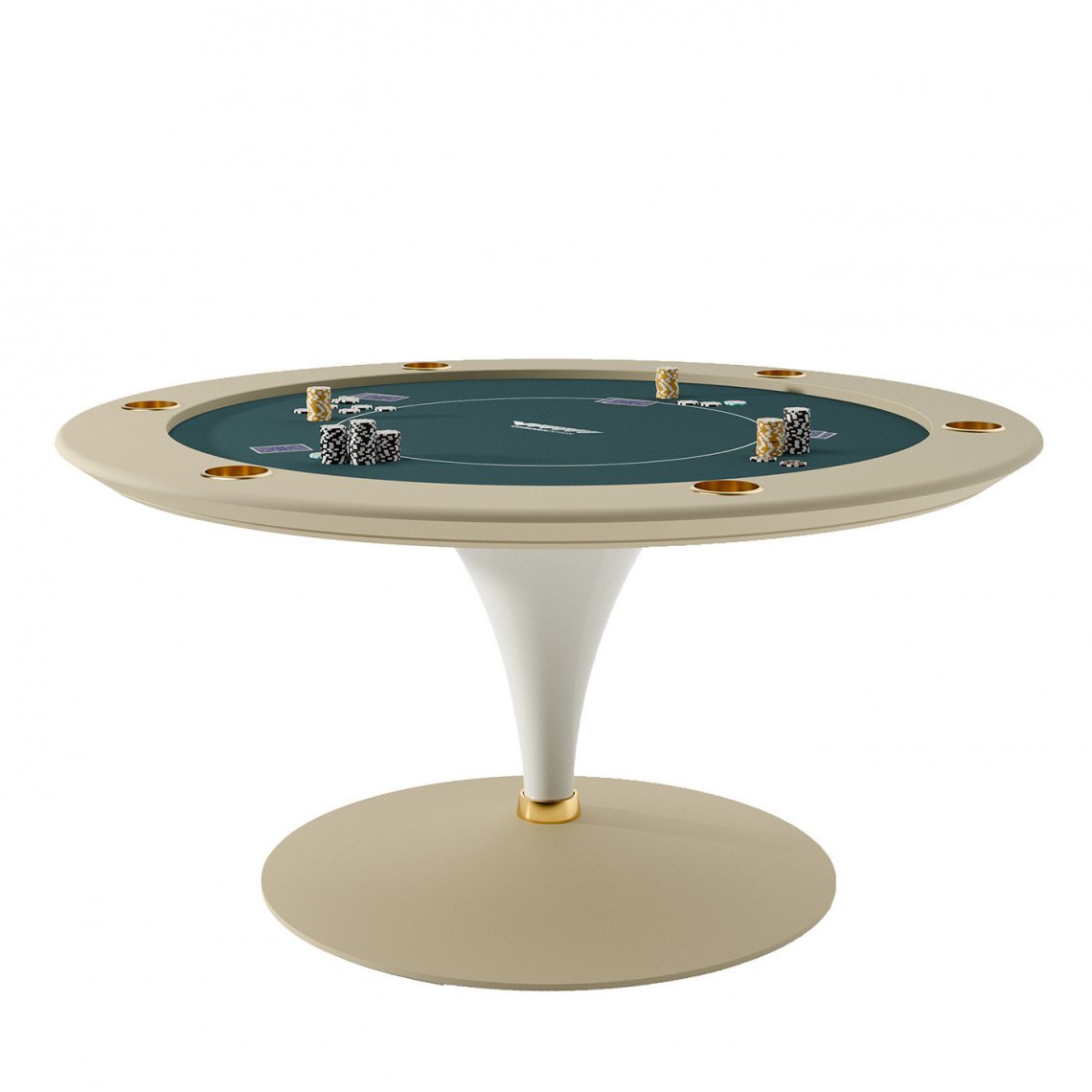 A splendid exercise in luxurious craftsmanship, this exquisite poker table will make a refined statement in a private game room. Marked by clean and essential lines, it features a lacquered MDF structure enriched with gold-pleated steel details, such as the six cup holders built into the round edges of the cloth-upholstered playing surface.