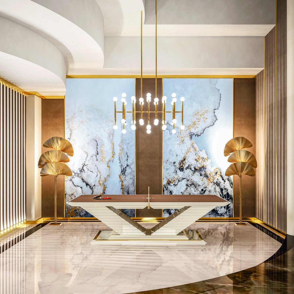 With its regal design, the Arena ping pong table adds an air of importance to a luxury game room. Supporting a matte brown surface, the table's V-shaped base is lacquered in a glossy ivory finish and accented with 24 karats gold-plated steel. Best of all, the net can be removed to use the table for dining or conferences.