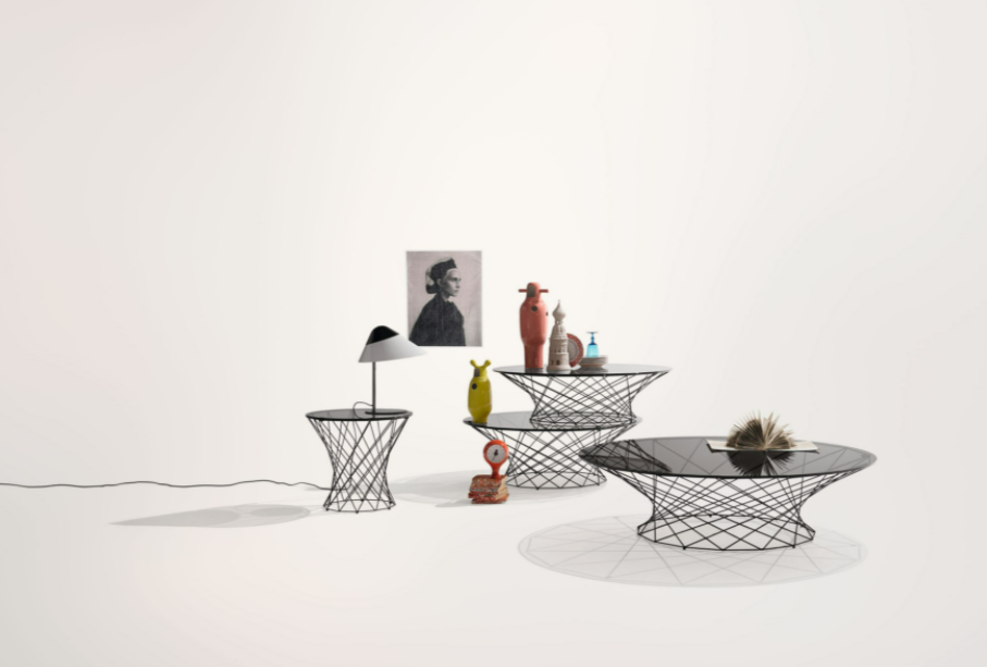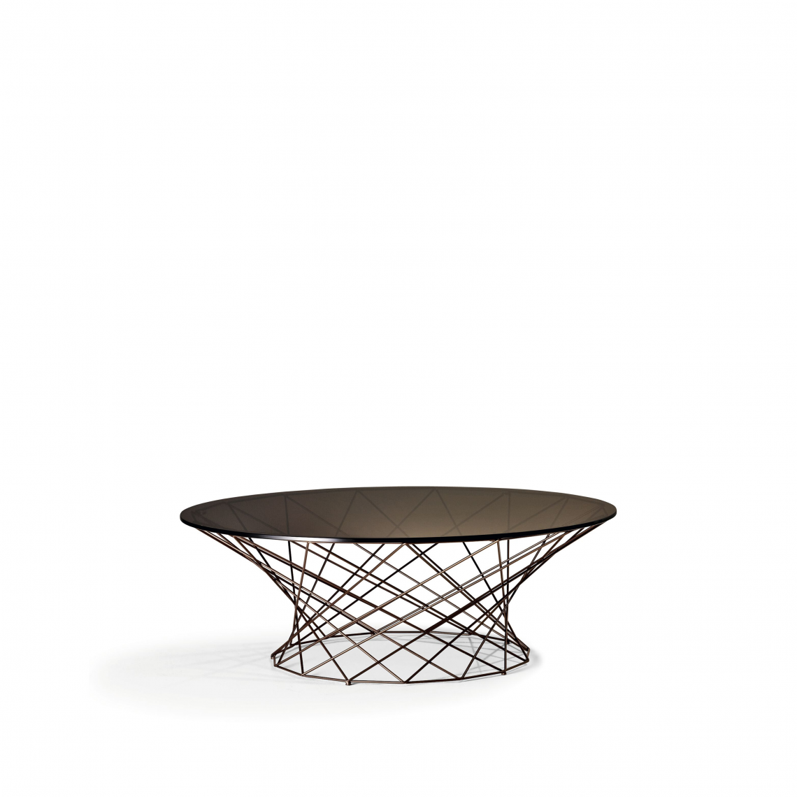 Elegant and brilliant as a piece of jewelry: delicate basketwork supports the round glass top, with its subtle and atmospheric reflection of light. Five different sizes are available, with coated or polished steel frame. Oota Side Table can be used as a sofa table or occasional table.