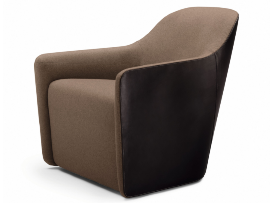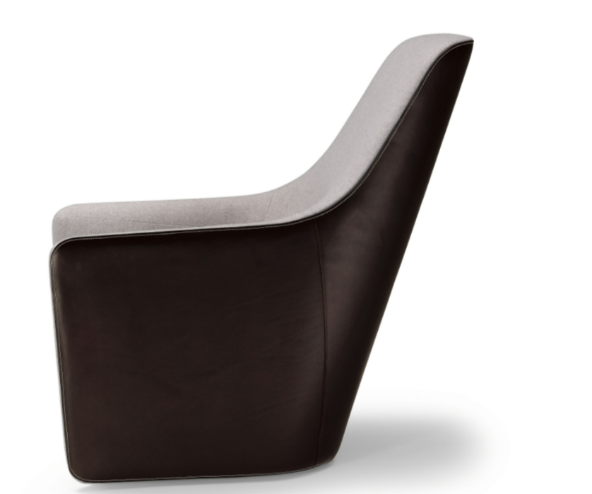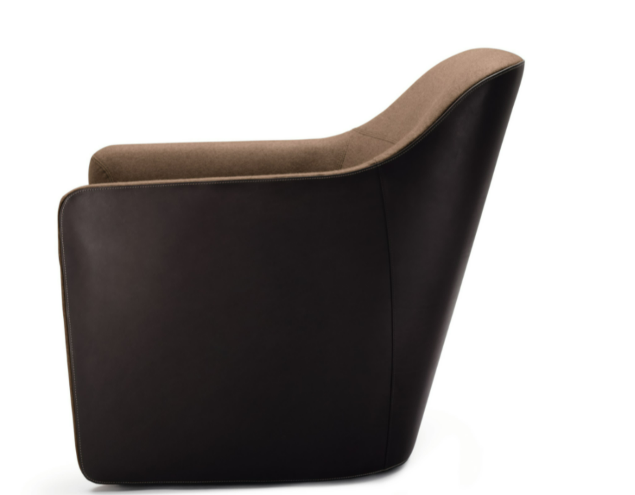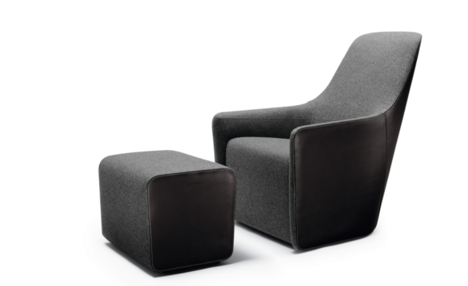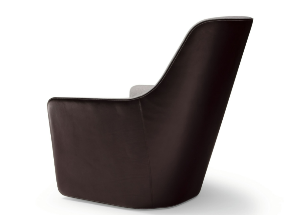 An effortless combination of materials: saddle leather with distinctive markings on the back, natural materials in the seat. The intricately worked stitching emphasizes the sweeping lines. It swivels easily or rests on feet – for longer periods of sitting during conferences or at a table. The separate stool completes the standalone chair.
