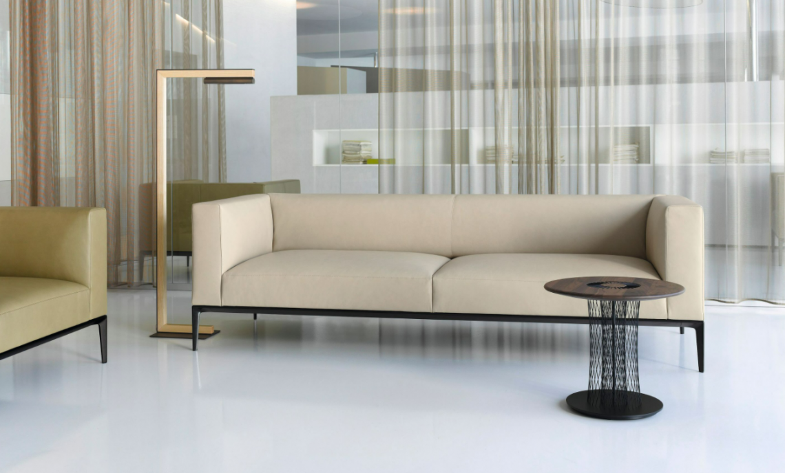 The compact spatial dimensions of this sofa with its firmly padded seat and back cushions float on delicate feet. The fine felled seams are a sign of experienced craftsmanship. Excellent design for two worlds: private and public. Available in three sizes, as a two- or three-seater.