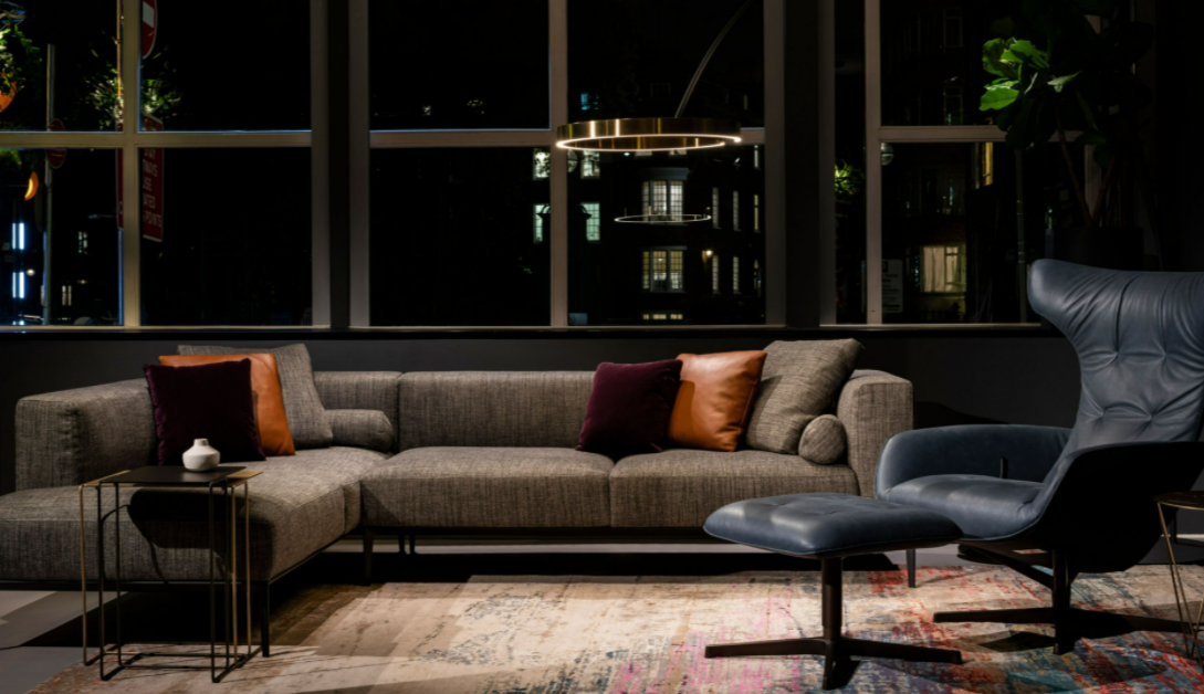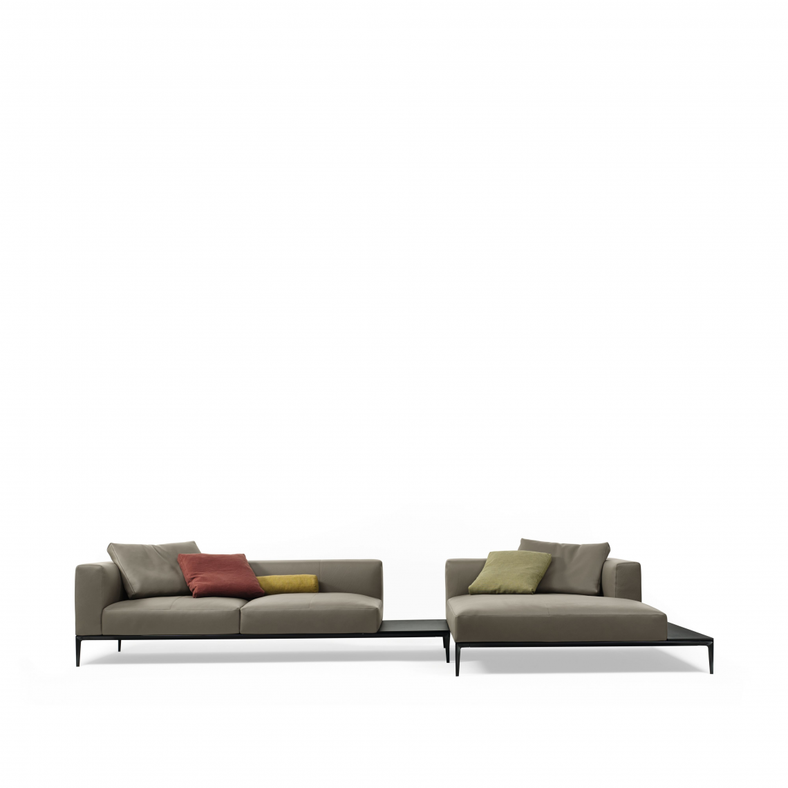 The generous upholstered surfaces of sofa and chaise longue unfold over the delicate frame and appear to be floating, in a balanced harmony of lightness and weight. Chic and inviting at the same time: the casual look of the leather complemented by the light down filling of the upholstery. A softness you want to sink into forever.