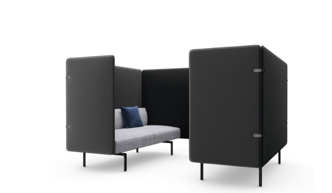 The screens of the Muud Silent Sofa make it possible to create a space in a large room where you can have confidential conversations and work on something together. A sustainable and economical solution – reduced in material and volume.