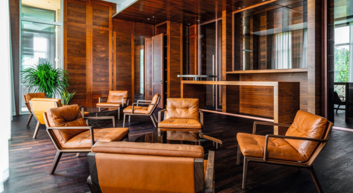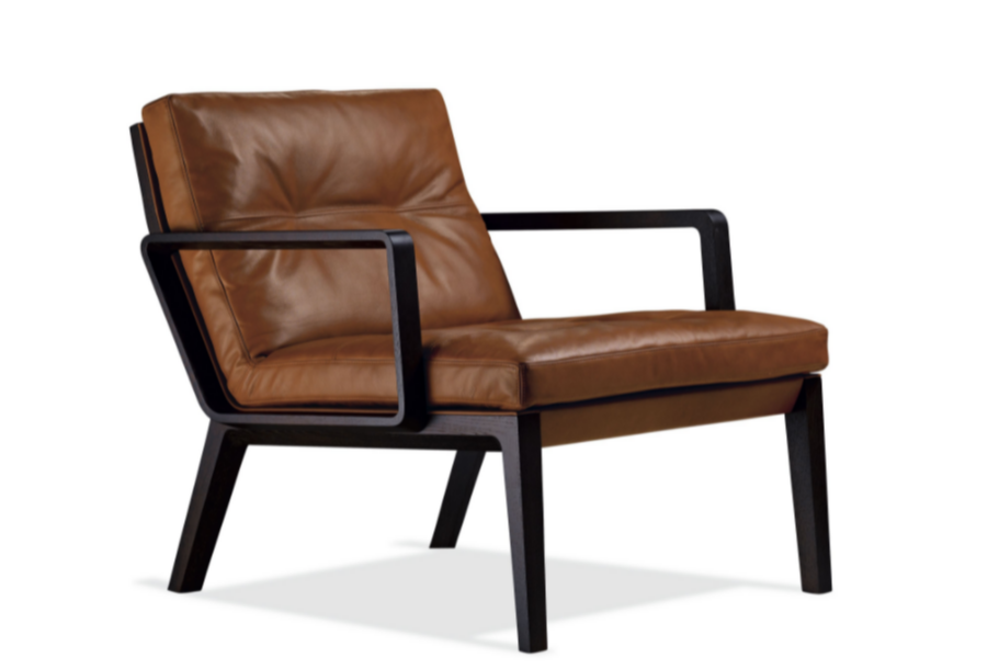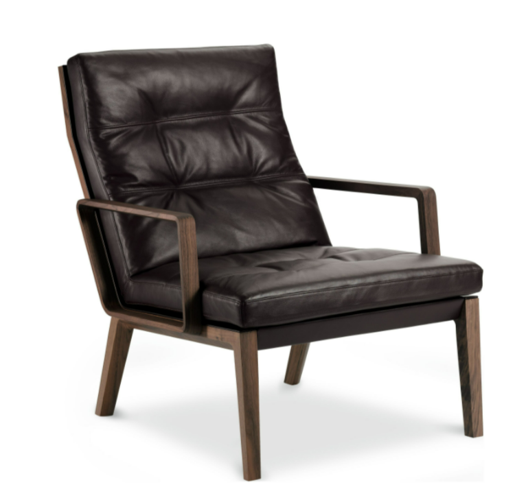 The lounge chair works in an exceptionally soft and intimate way: inviting upholstery, soft leather with stitched piping, elegant and inwardly contoured wood. Available with high or low back and an accompanying stool.
