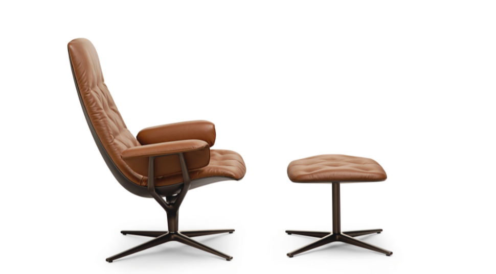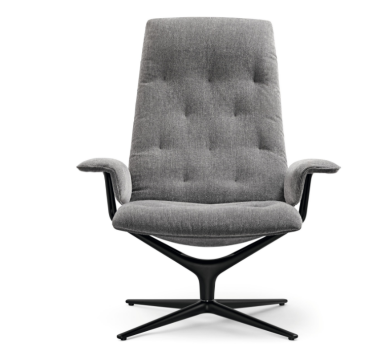 A modern lounge chair with a softly upholstered inner shell, elegant indentations, and pleasantly soft armrests. Whether solo or paired with a sofa, for cocktails, for work, or as a place of private retreat – this is an armchair in which to linger and relax. Also available: the matching Healey Soft Stool.