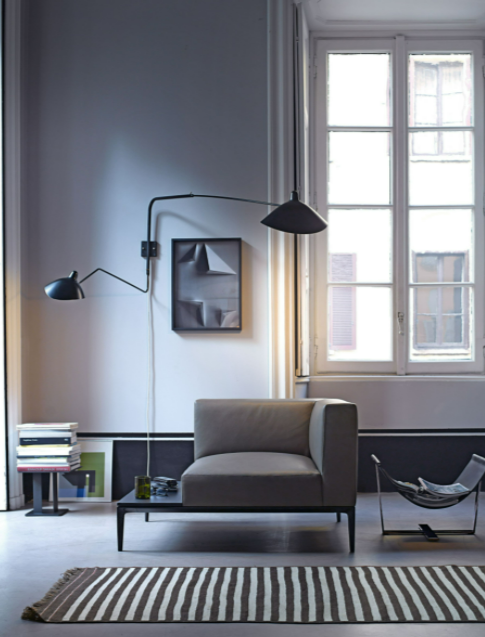 The compact spatial dimensions of the solidly upholstered chair are poised on delicate feet. The fine felled seams are a sign of expert craftsmanship. The chair-chaise longue can be fitted with side shelves. Excellent design for two worlds: private and public.