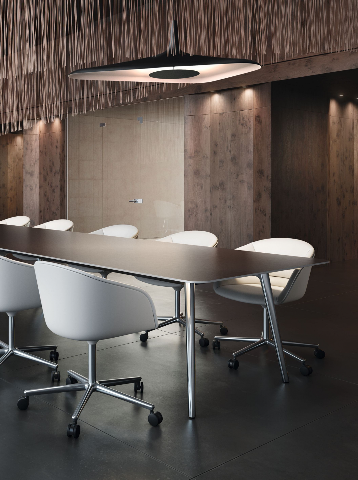 Striking seam patterns fine-tune the upholstery like the seats in a sports car. The shell – with a plastic exterior or completely covered with fabric or leather – ensures outstanding seating comfort. Easy to swivel on a four-star or a five-star base, optionally with castors, the bucket chair provides a different impression from every angle.