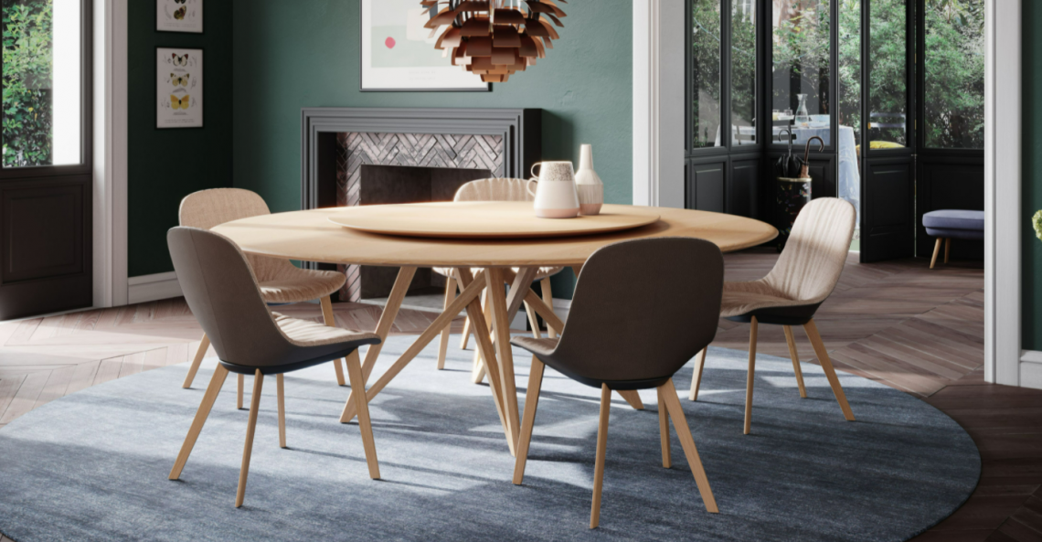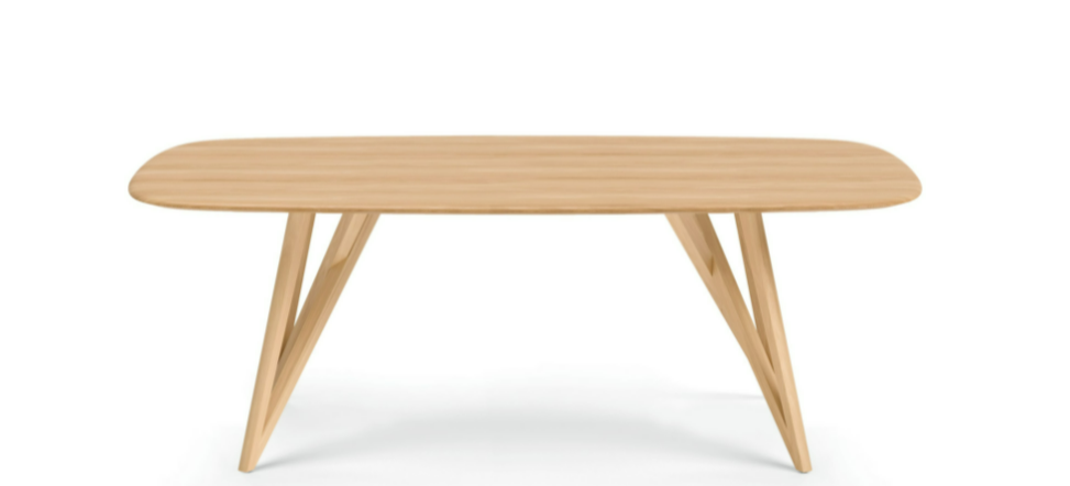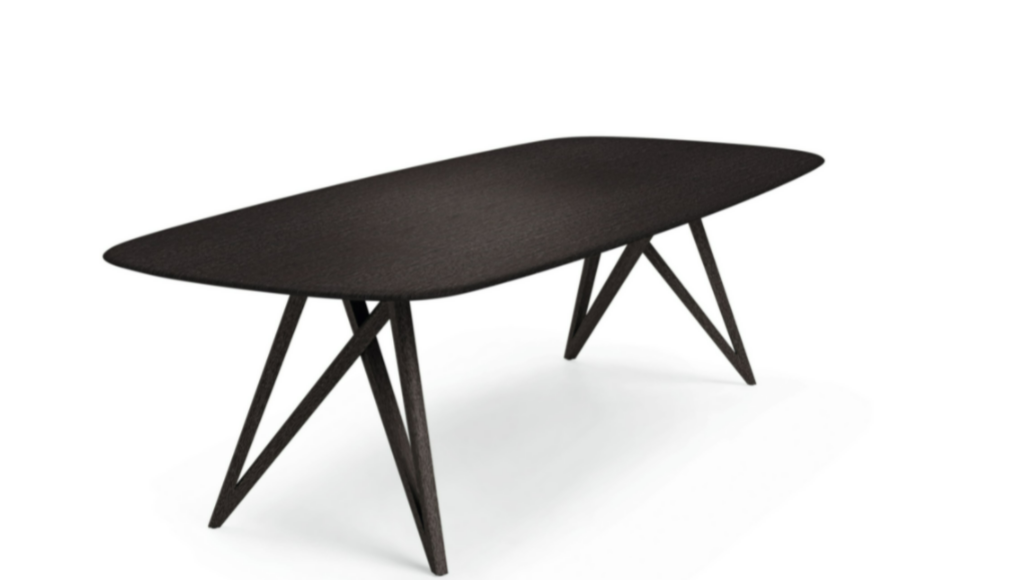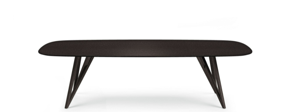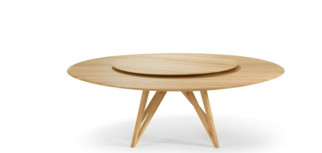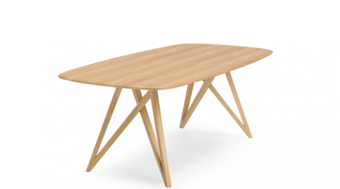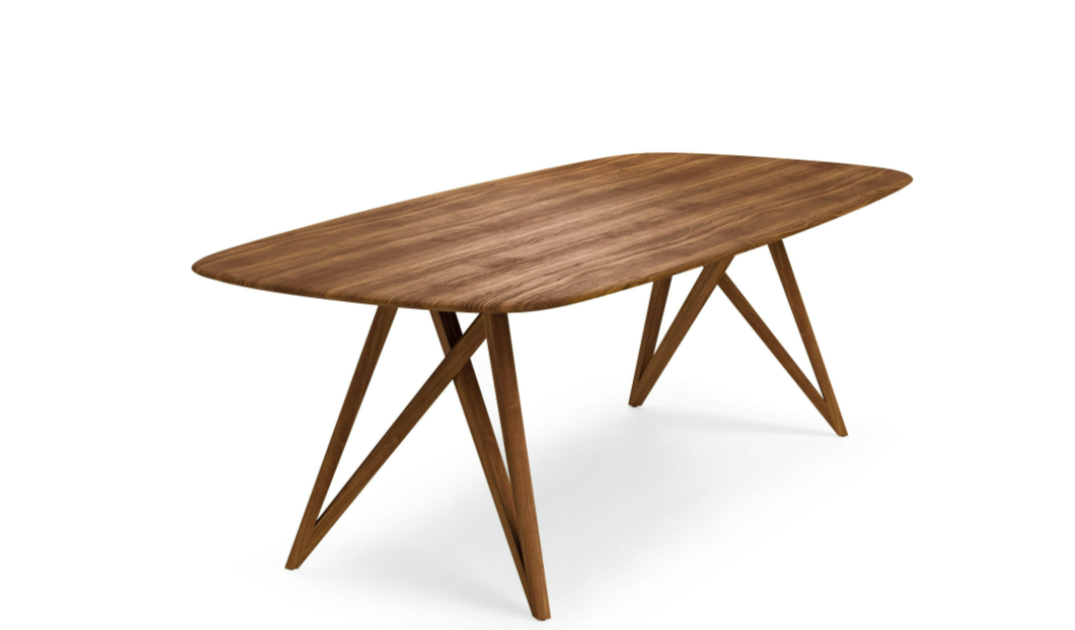 A unique table sculpture made of solid wood: a playful sense of lightness emerges through a balance of lines, angles and surfaces. The table top and the crossed base can be made from the finest woods, such as oak or nutwood. The wooden table comes in a boat shape and as a round dining table –?each in different sizes.