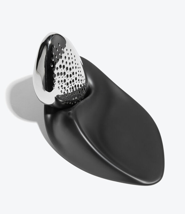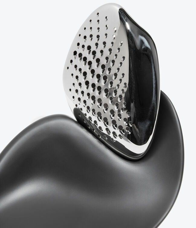 Forma Cheese Grater - polished stainless steel and melamine - consists of two parts - the grater with a gradation of perforations, can be handheld and separated from the sculptural base - a ZHD x Alessi collaboration.