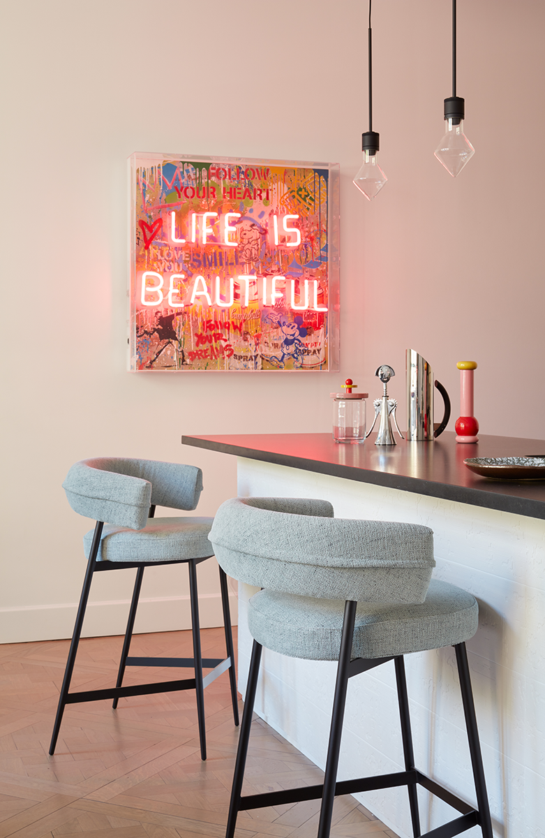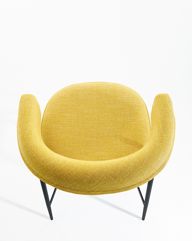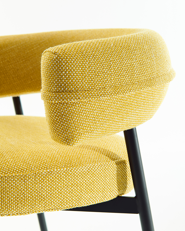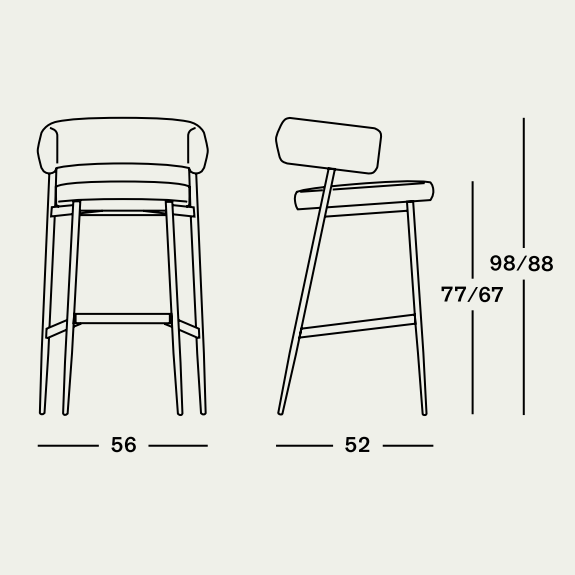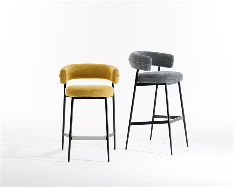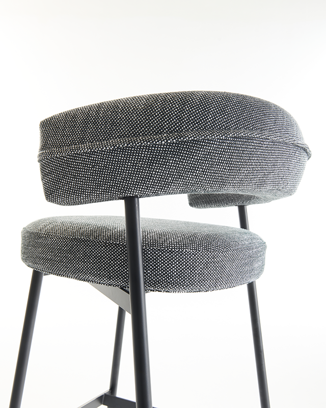 凳子。石墨黑或啞光黑色漆面鋼架機(jī)構(gòu)。坐墊填充漸變聚氨酯,靠背填充自熄性聚氨酯泡沫。可拆卸布料或皮革護(hù)套。覆面擱腳采用緞面不銹鋼制成。