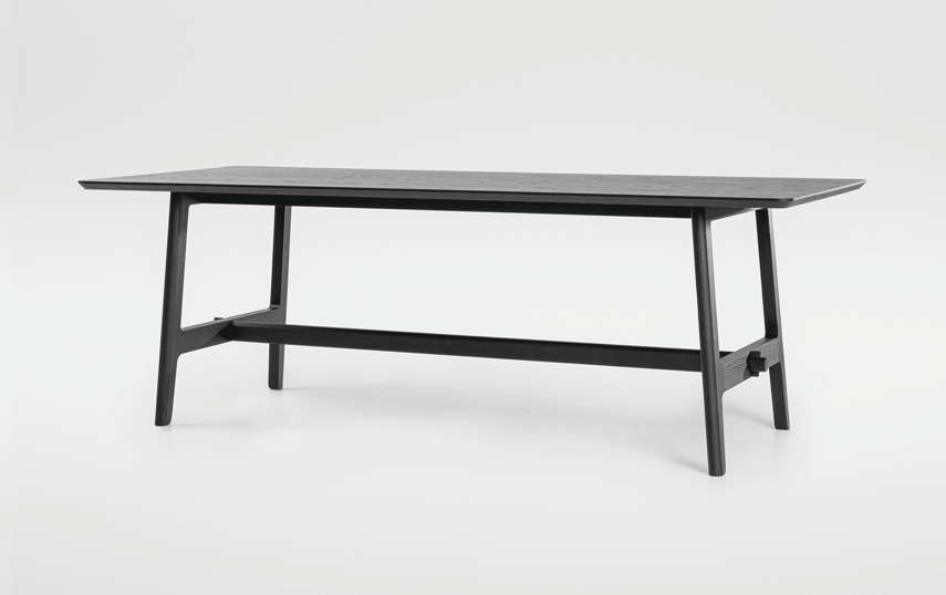 The basic design of the table is based on the plug-in connections of the VNA CHAIR stabelle. The cross frame and the associated visible wedging are typical of the Alpine region. The lateral H-shaped constructions are connected to the foot frame.