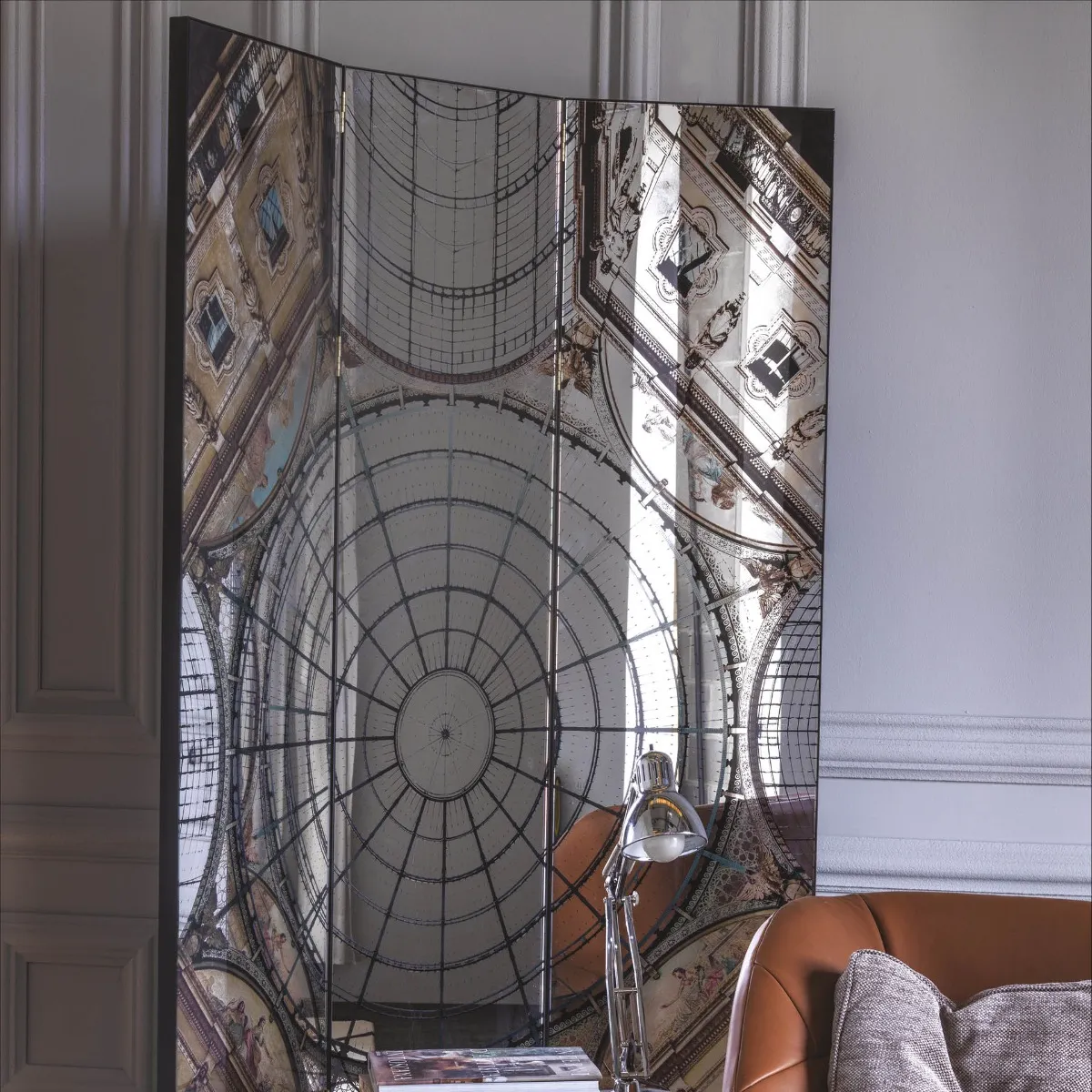 La fotografia e il design sono discipline strettamente correlate. Quanti oggetti meravigliosi abbiamo in realtà conosciuto più attraverso la loro immagine che non per un rapporto di fruizione diretta? In questo caso però la storia è diversa: un fotografo si fa designer per portare nelle case di molti le sue visioni del mondo. In particolare una, la galleria Vittorio Emanuele, che rappresenta per Milano, da quando il Mengoni la concepì nel 1865, un emblema. Ma come si può trasformare una fotografia in oggetto? Ad esempio inserendola in un paravento-opera che, inaspettatamente, sul fronte posteriore propone uno specchio: uno specchio “a trittico” con cui percepire tutt’intera la nostra figura, come una volta nelle sartorie.