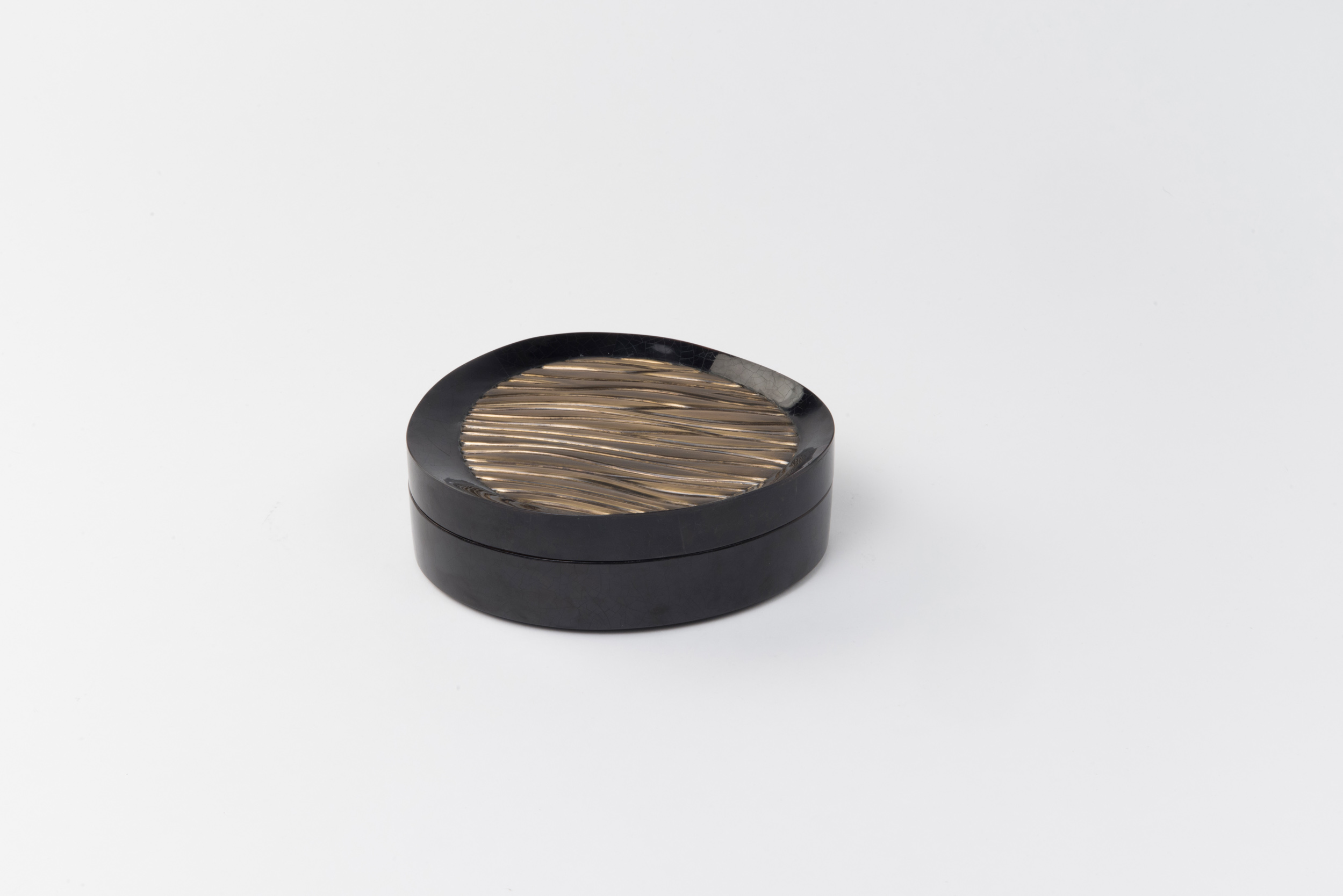 With her soft lines and intricate bronze-patina brass inlay, the Pendant Box S is a beautiful accent for all interiors. This item is available in other finishes and a medium size.