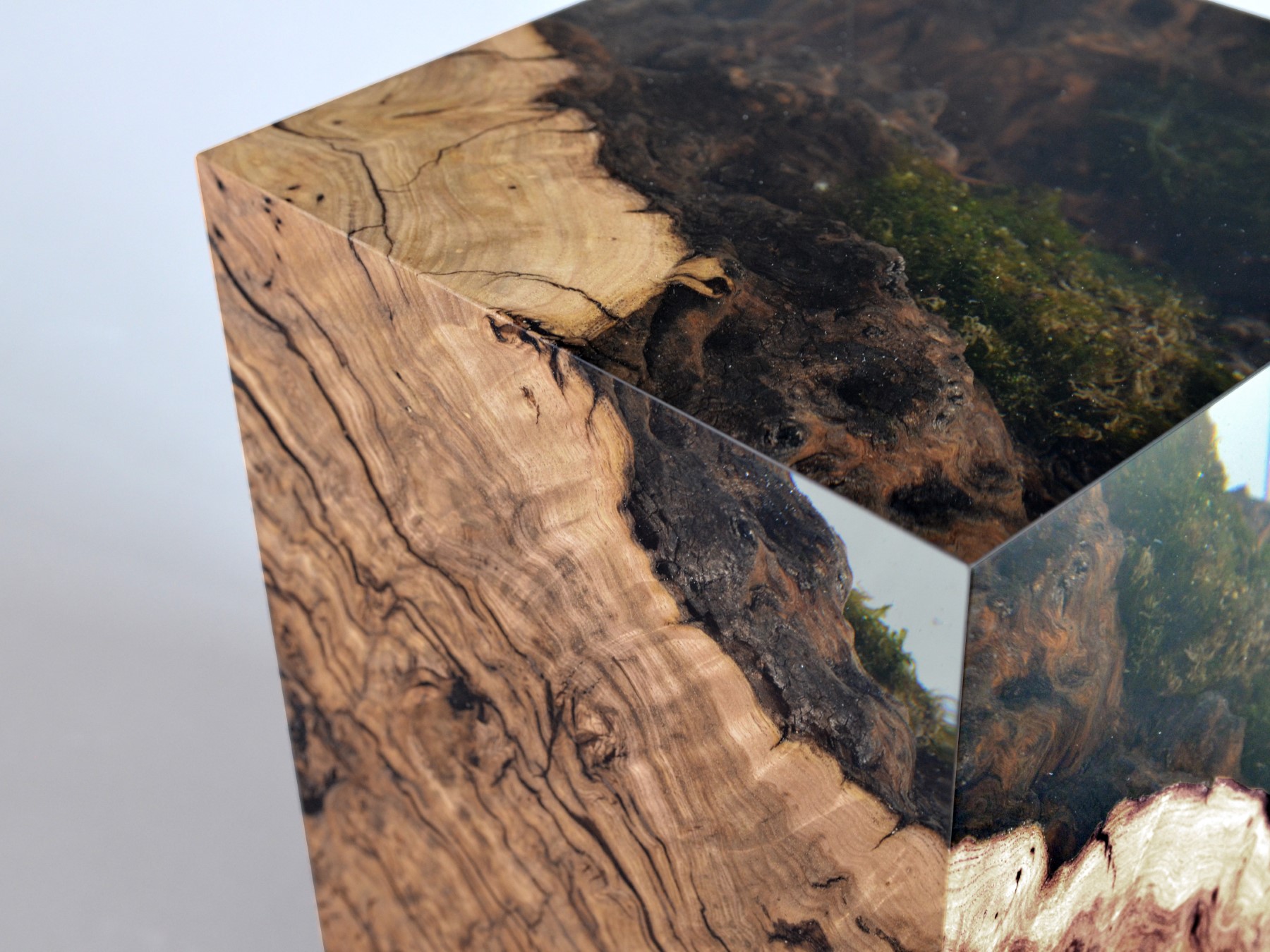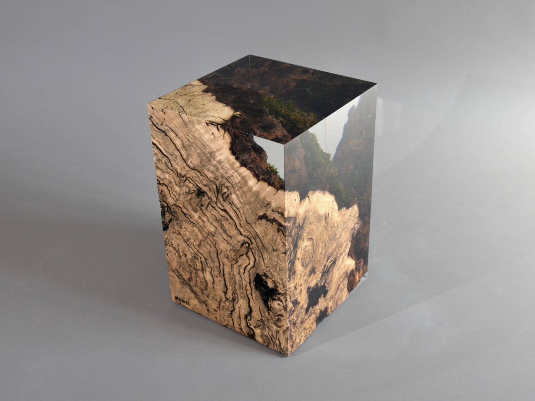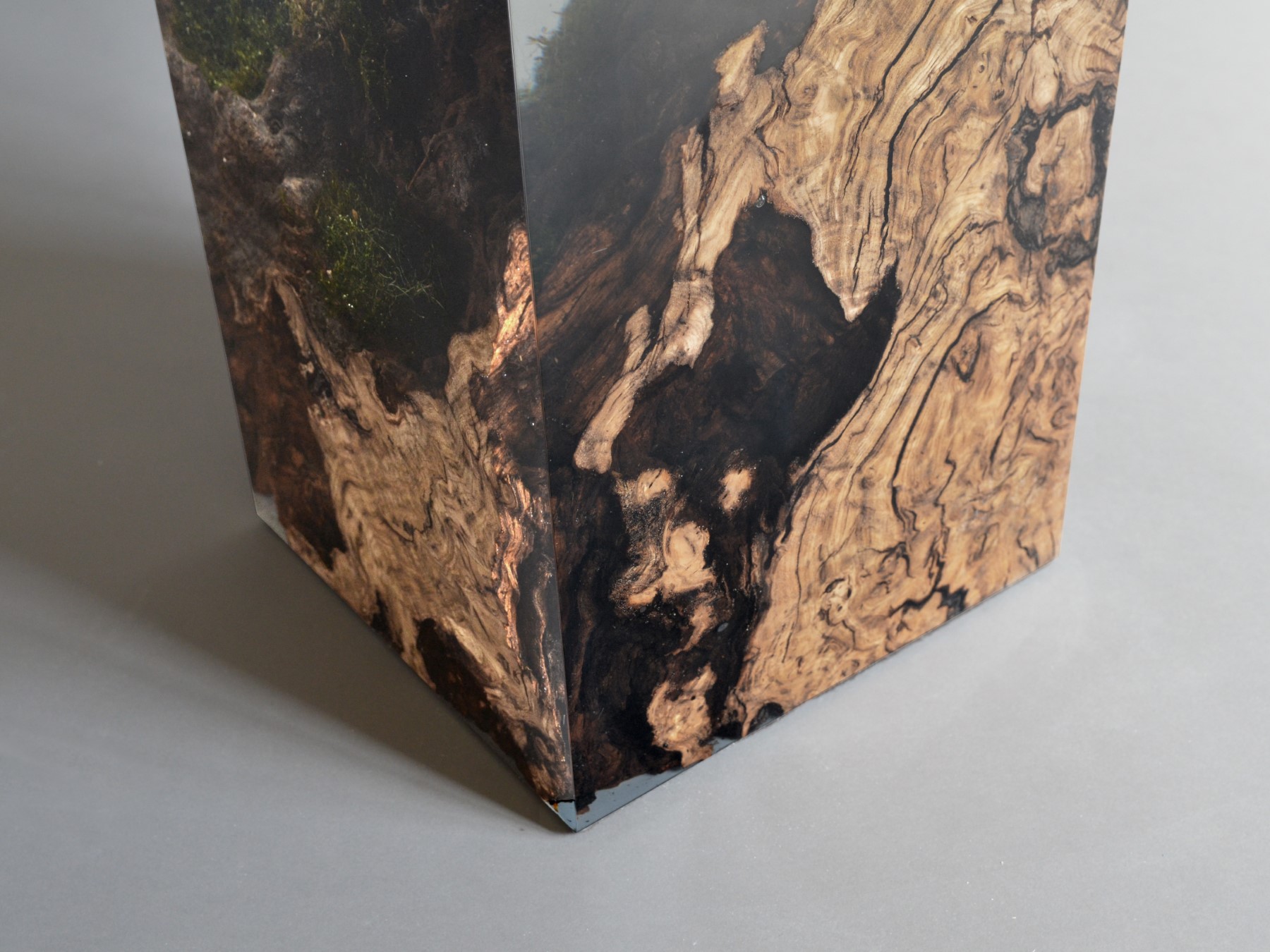 alcarol recover discarded pieces of Burled Chestnut log from a wetland of the Italian Dolomite countryside and preserve the natural bark surface with its native populations of plants, which are embedded in a transparent resin resembling the habitat water that generated their life.