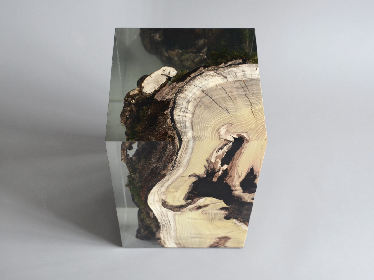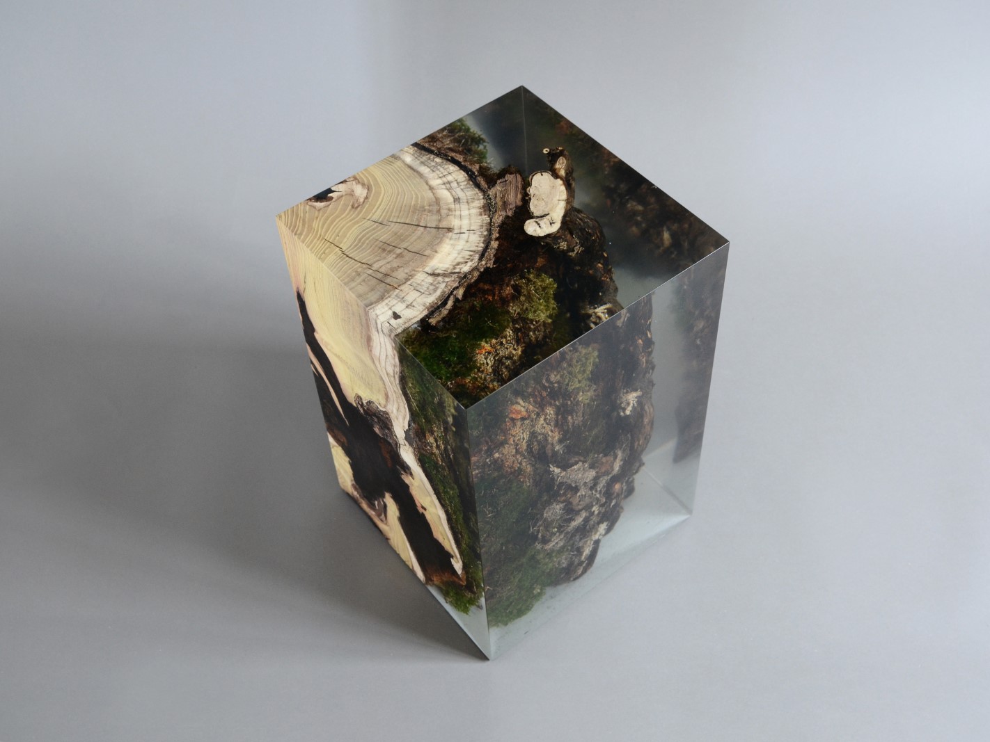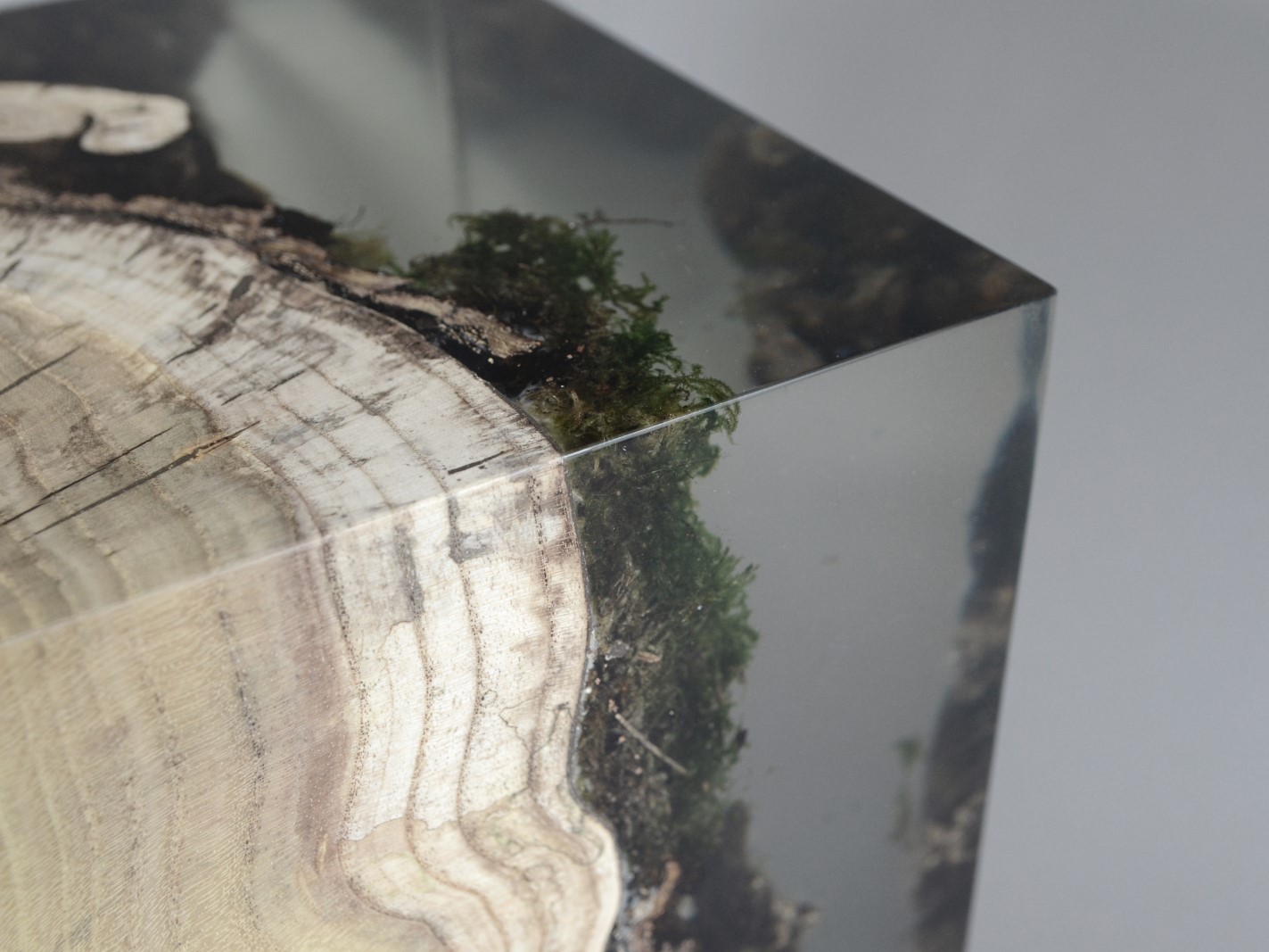 alcarol recover discarded pieces of Mulberry log from a wetland of the Italian Dolomite countryside and preserve the natural bark surface with its native populations of plants, which are embedded in a transparent resin resembling the habitat water that generated their life.