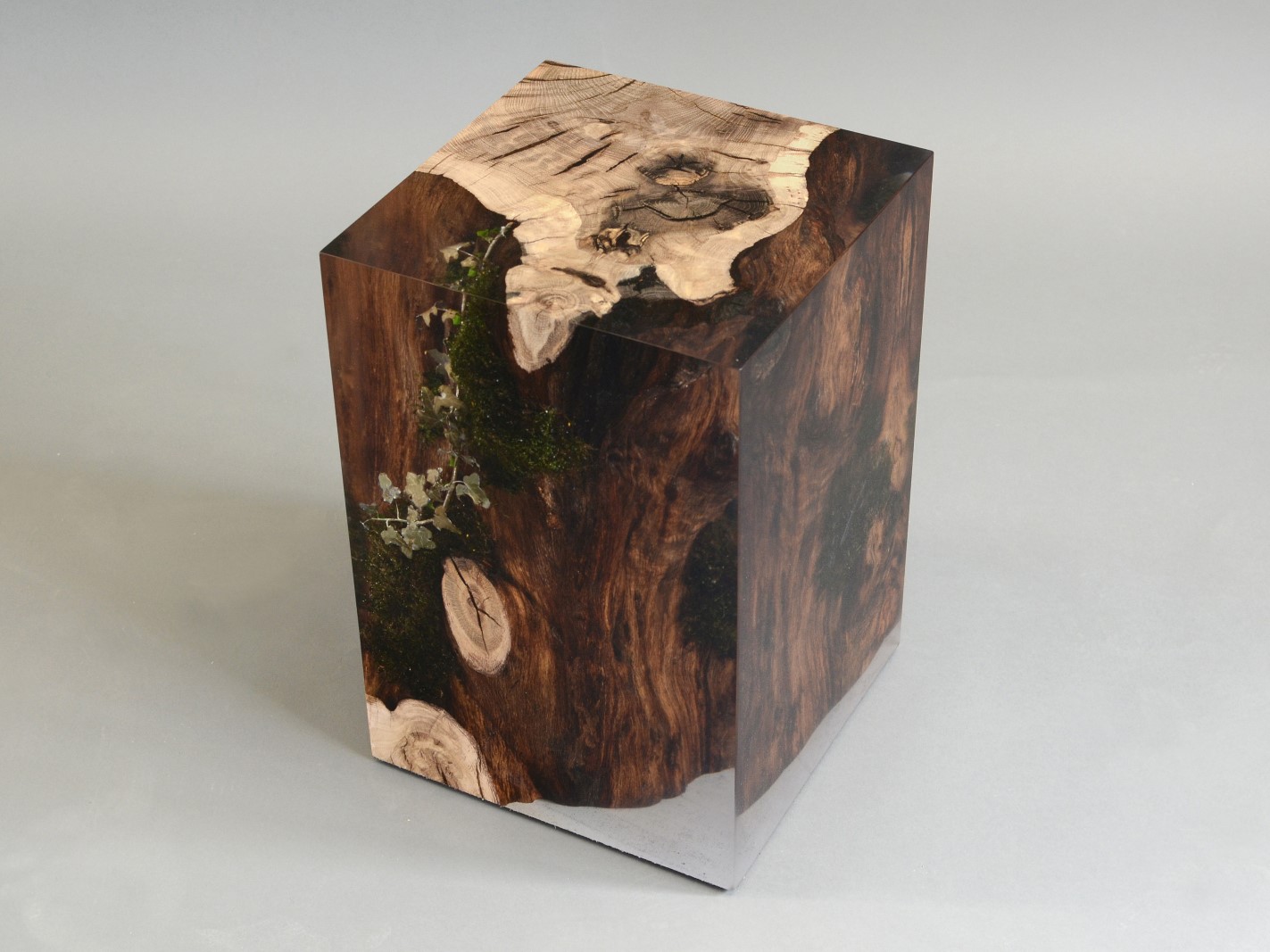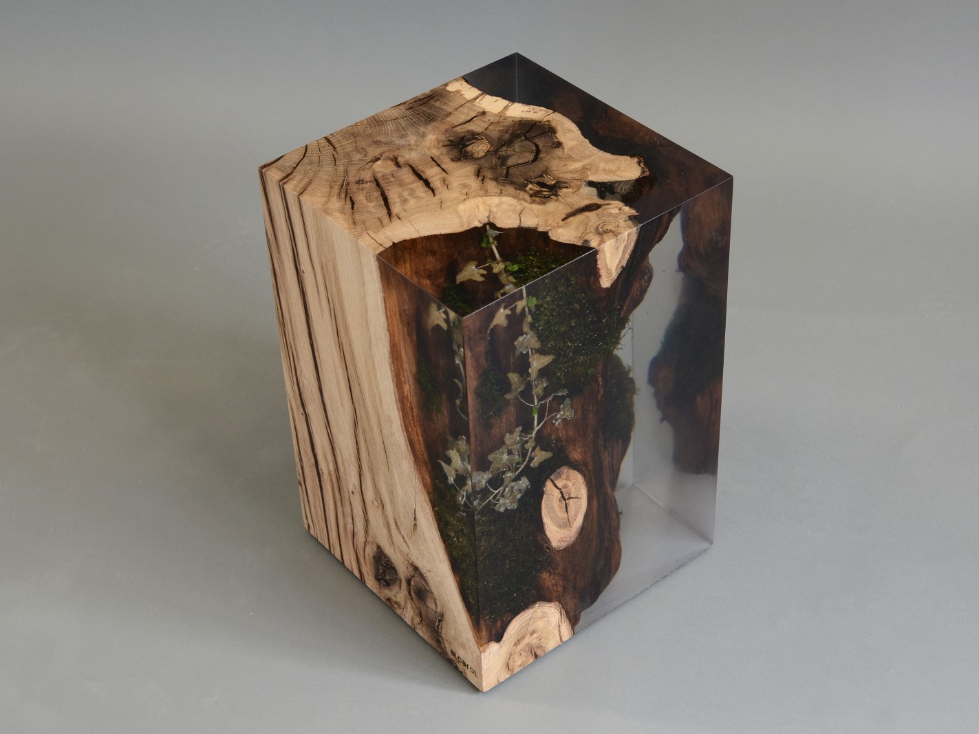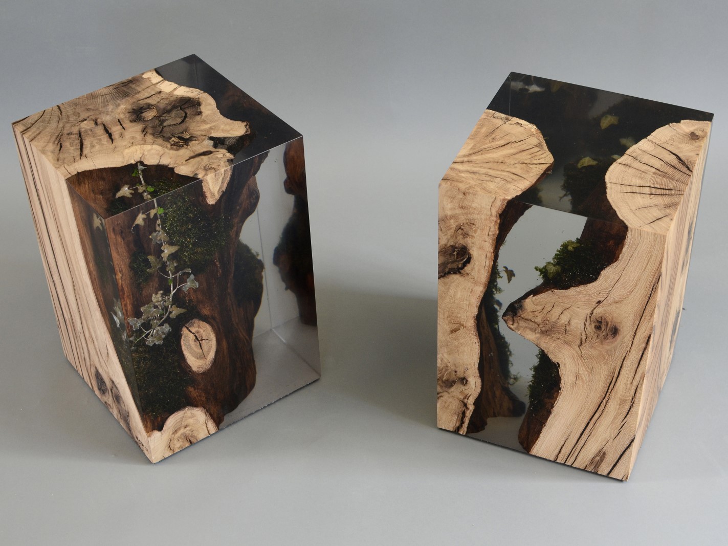 alcarol recover discarded pieces of logs from the undergrowth of the Italian Dolomite mountains and preserve the natural bark surface with their native populations of plants, which are embedded in a resin resembling the water that generated their life.