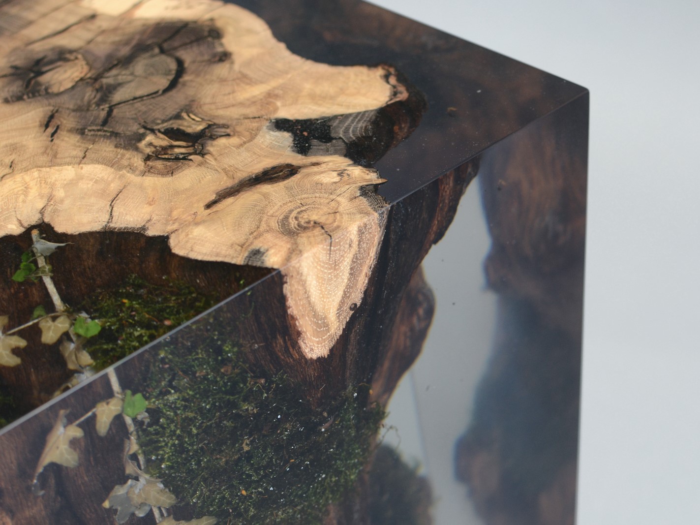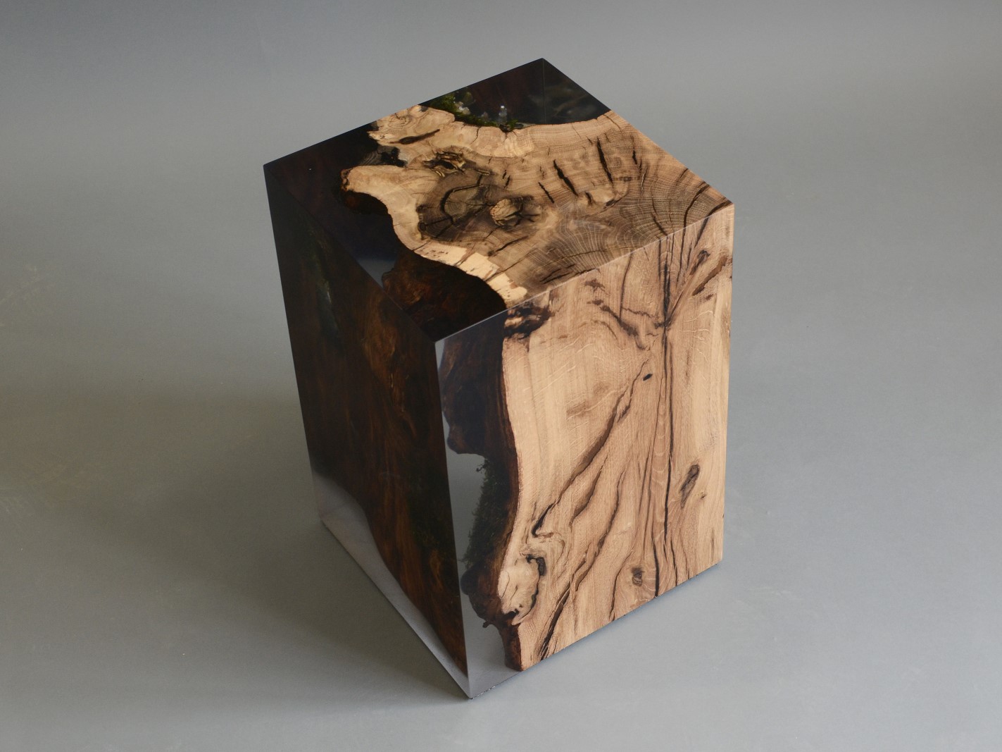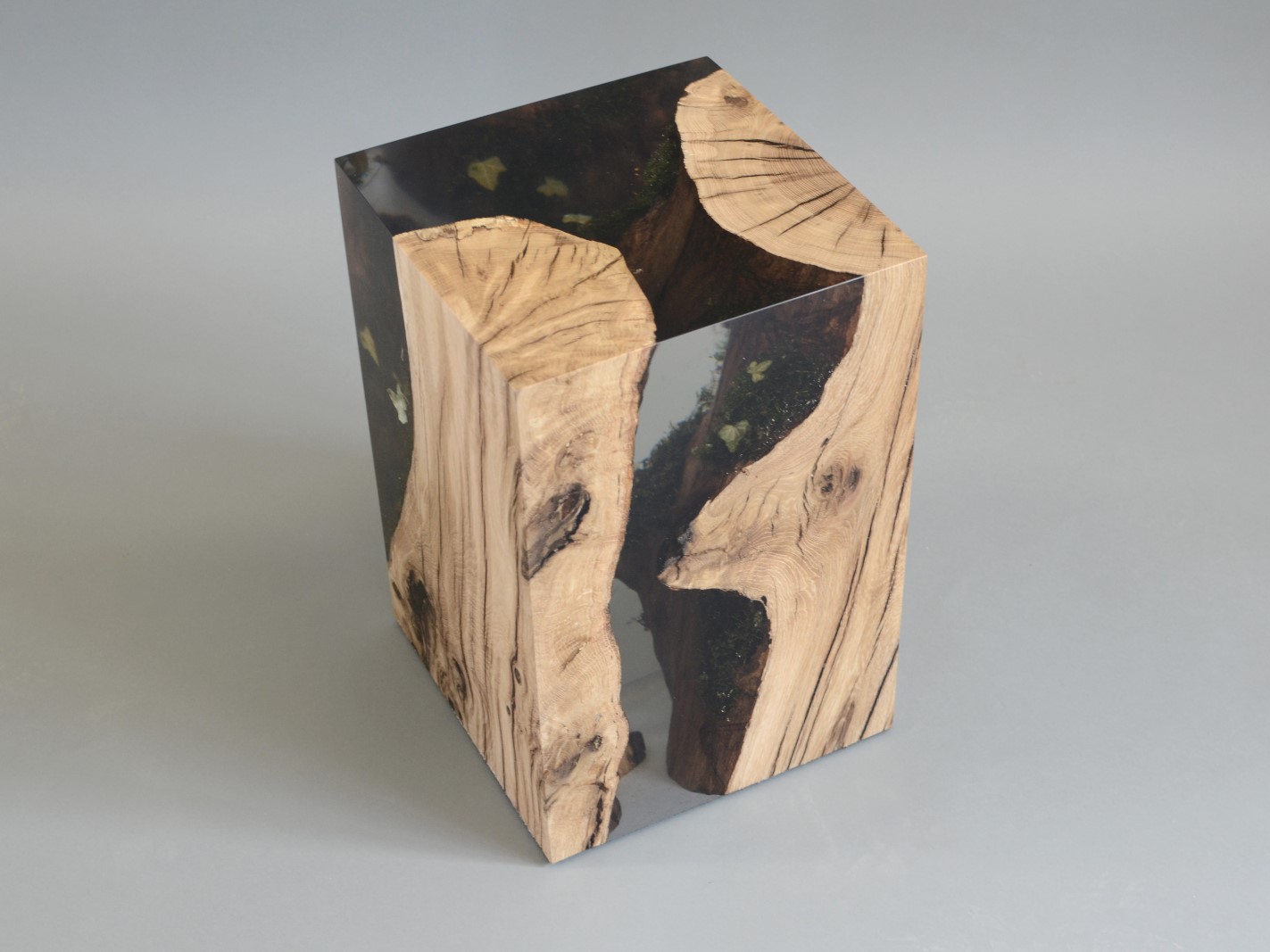alcarol recover discarded pieces of logs from the undergrowth of the Italian Dolomite mountains and preserve the natural bark surface with their native populations of plants, which are embedded in a resin resembling the water that generated their life.
