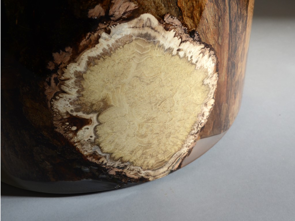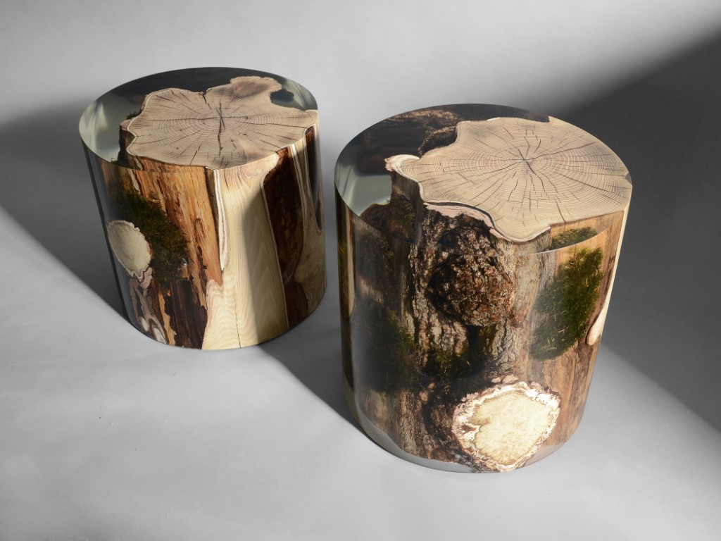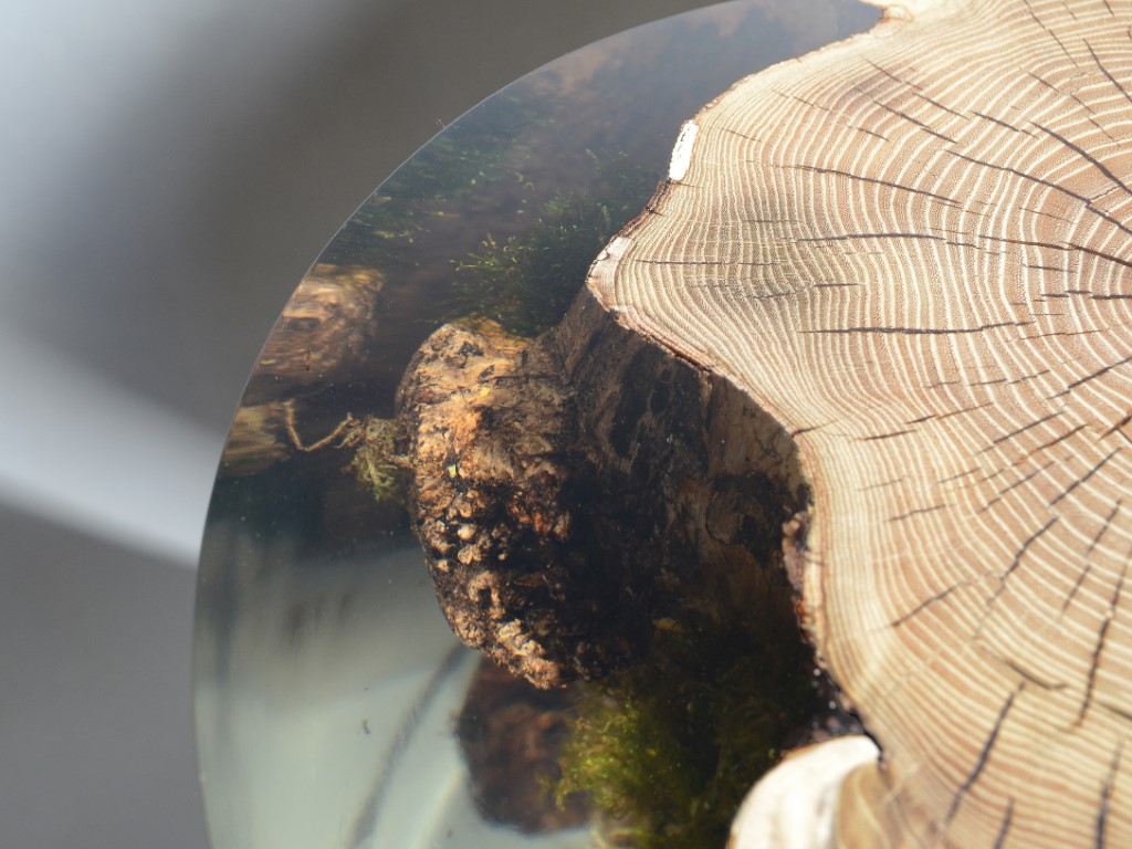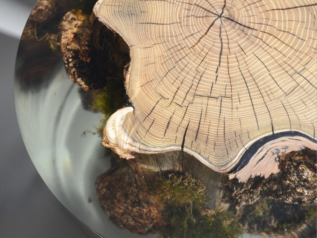 After the terrible flood of 2018, alcarol has recovered some discarded pieces of logs from the undergrowth of the Italian Dolomite mountains and has preserved the natural bark surface with their native populations of plants, which are embedded in a resin resembling the water that created and ended his life. All environmental traces on the raw material are thoroughly studied to discover and preserve the specific Genius Loci.