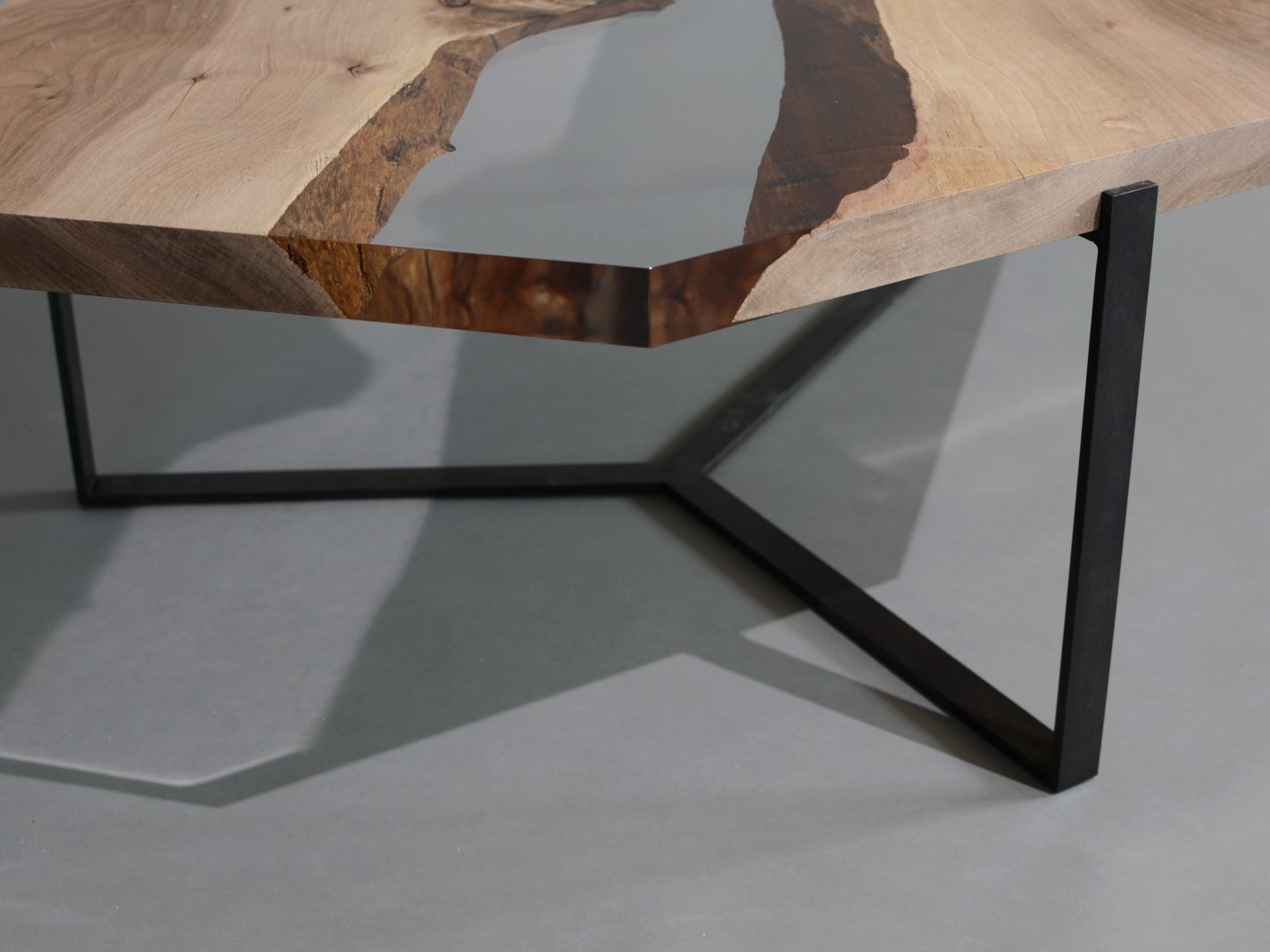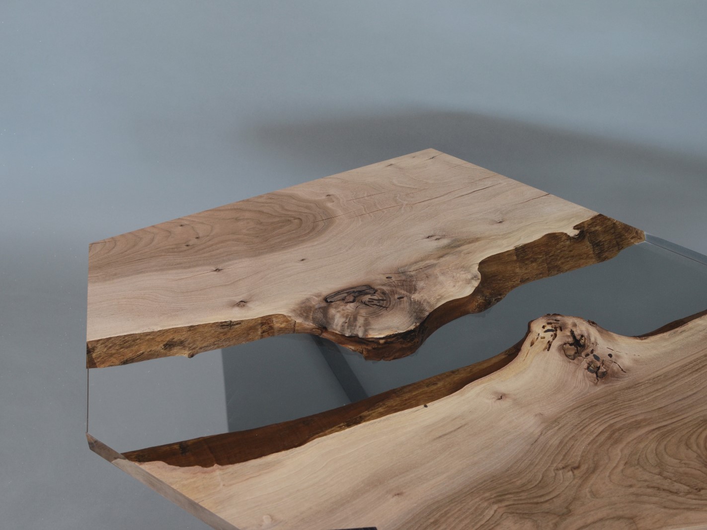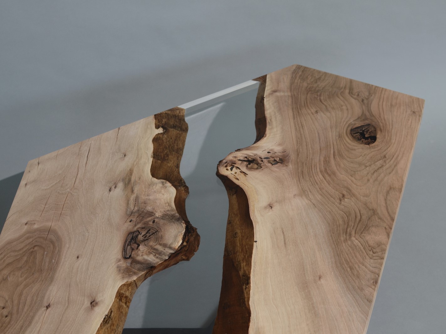 A special crystalline resin fill the gaps between the wood live edges completing the prisms and preserving their story.