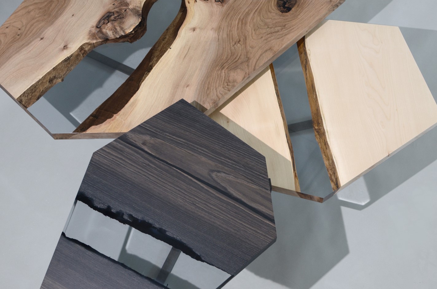 The Crystal Wood Trio is inspired by the process of crystal formation and growth that extends in many directions and heights, with the aim to connect the organic shapes of wood with the rigid geometries of the minerals.